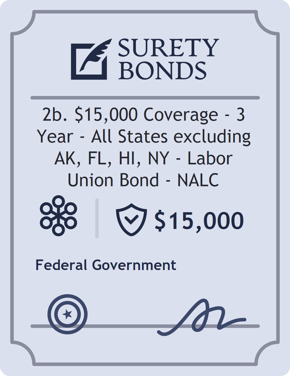 The 2b. $15,000 Coverage – 3 Year – All States excluding AK, FL, HI, NY – Labor Union Bond – NALC is classified as a Miscellaneous Bonds with a $15,000 obligation in Federal. Miscellaneous Bonds cover a wide range of non-standard surety bond requirements. They act as financial protection in cases where state or federal regulations require assurance of compliance and ethical conduct. The surety reviews financial strength, compliance history, and indemnity support before approving the obligation. Maintaining uninterrupted coverage for the entire 1 Year term is essential; lapses can trigger penalties, contract defaults, or license suspension in Federal. Underwriters typically request financial statements, references, and proof of licensing before quoting terms so they can evaluate repayment capacity. Throughout the bond term, the principal must maintain accurate books, respond to regulator inquiries, and remediate any complaints to prevent a claim. Many authorities in Federal also require renewal certificates 30 to 60 days in advance, and failure to provide proof can halt permitting or bid submissions. The $15,000 limit demonstrates to customers, partners, and oversight agencies that the bonded party maintains a reliable, surety-backed source of funds dedicated to ongoing compliance. The obligee for this bond is 2b. $15,000 Coverage – 3 Year – All States excluding AK, FL, HI.