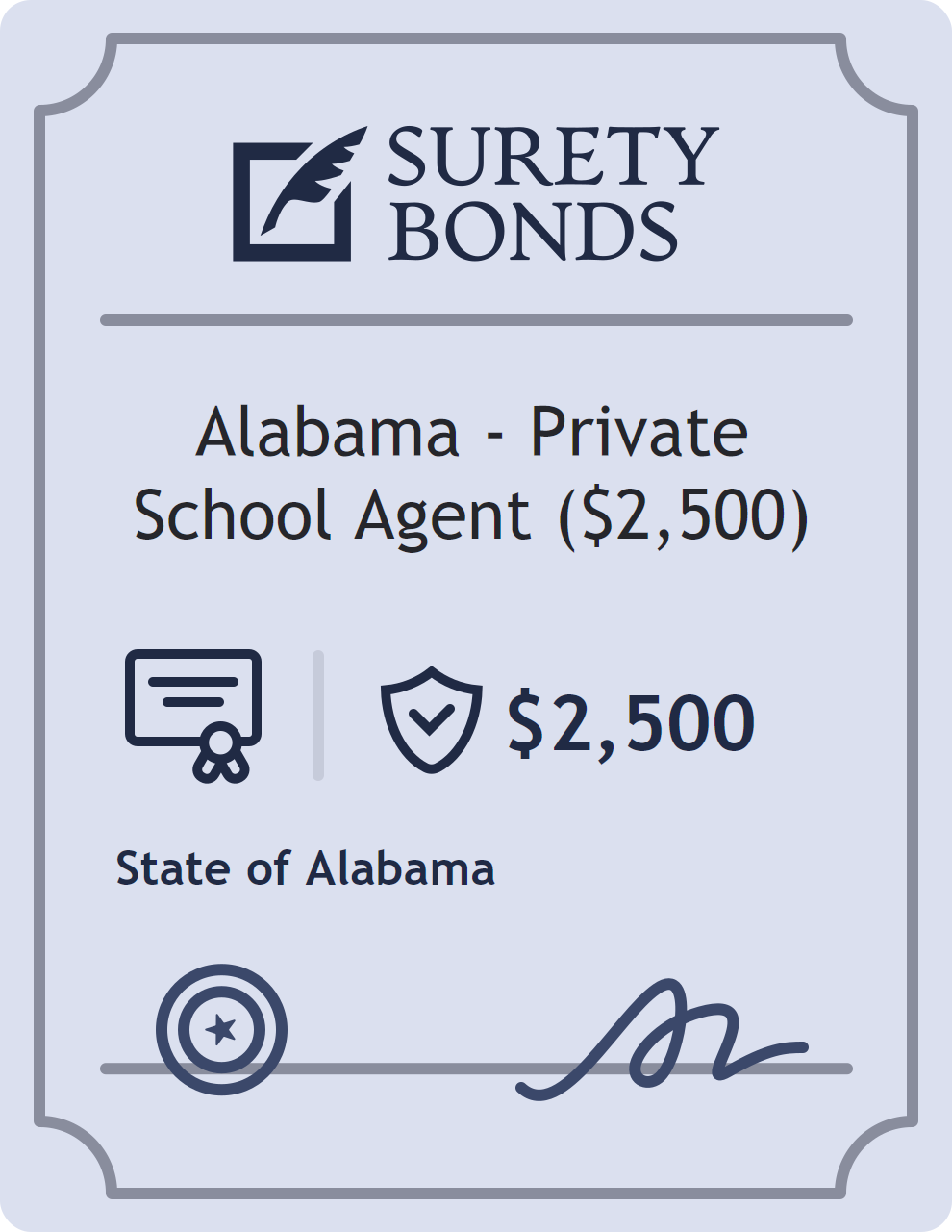 The Alabama – Private School Agent ($2,500) is classified as a Professional License Bonds with a $2,500 obligation in Alabama. Professional License Bonds are surety bonds required for licensed professionals across various industries. They guarantee compliance with licensing laws and ethical standards, protecting clients and regulatory bodies from harm. The surety reviews financial strength, compliance history, and indemnity support before approving the obligation. Maintaining uninterrupted coverage for the entire 1 Year term is essential; lapses can trigger penalties, contract defaults, or license suspension in Alabama. Underwriters typically request financial statements, references, and proof of licensing before quoting terms so they can evaluate repayment capacity. Throughout the bond term, the principal must maintain accurate books, respond to regulator inquiries, and remediate any complaints to prevent a claim. Many authorities in Alabama also require renewal certificates 30 to 60 days in advance, and failure to provide proof can halt permitting or bid submissions. The $2,500 limit demonstrates to customers, partners, and oversight agencies that the bonded party maintains a reliable, surety-backed source of funds dedicated to ongoing compliance. The obligee for this bond is State of Alabama.