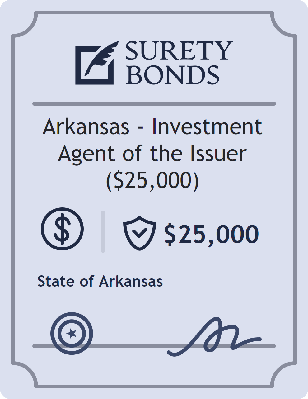 The Arkansas – Investment Agent of the Issuer ($25,000) is classified as a Financial Services Bonds with a $25,000 obligation in Arkansas. Financial Services Bonds are surety bonds designed for businesses in the financial industry, including brokers, lenders, and other financial institutions. These bonds guarantee compliance with financial regulations and provide protection against misconduct or fraud. The surety reviews financial strength, compliance history, and indemnity support before approving the obligation. Maintaining uninterrupted coverage for the entire 1 Year term is essential; lapses can trigger penalties, contract defaults, or license suspension in Arkansas. Underwriters typically request financial statements, references, and proof of licensing before quoting terms so they can evaluate repayment capacity. Throughout the bond term, the principal must maintain accurate books, respond to regulator inquiries, and remediate any complaints to prevent a claim. Many authorities in Arkansas also require renewal certificates 30 to 60 days in advance, and failure to provide proof can halt permitting or bid submissions. The $25,000 limit demonstrates to customers, partners, and oversight agencies that the bonded party maintains a reliable, surety-backed source of funds dedicated to ongoing compliance. The obligee for this bond is State of Arkansas.