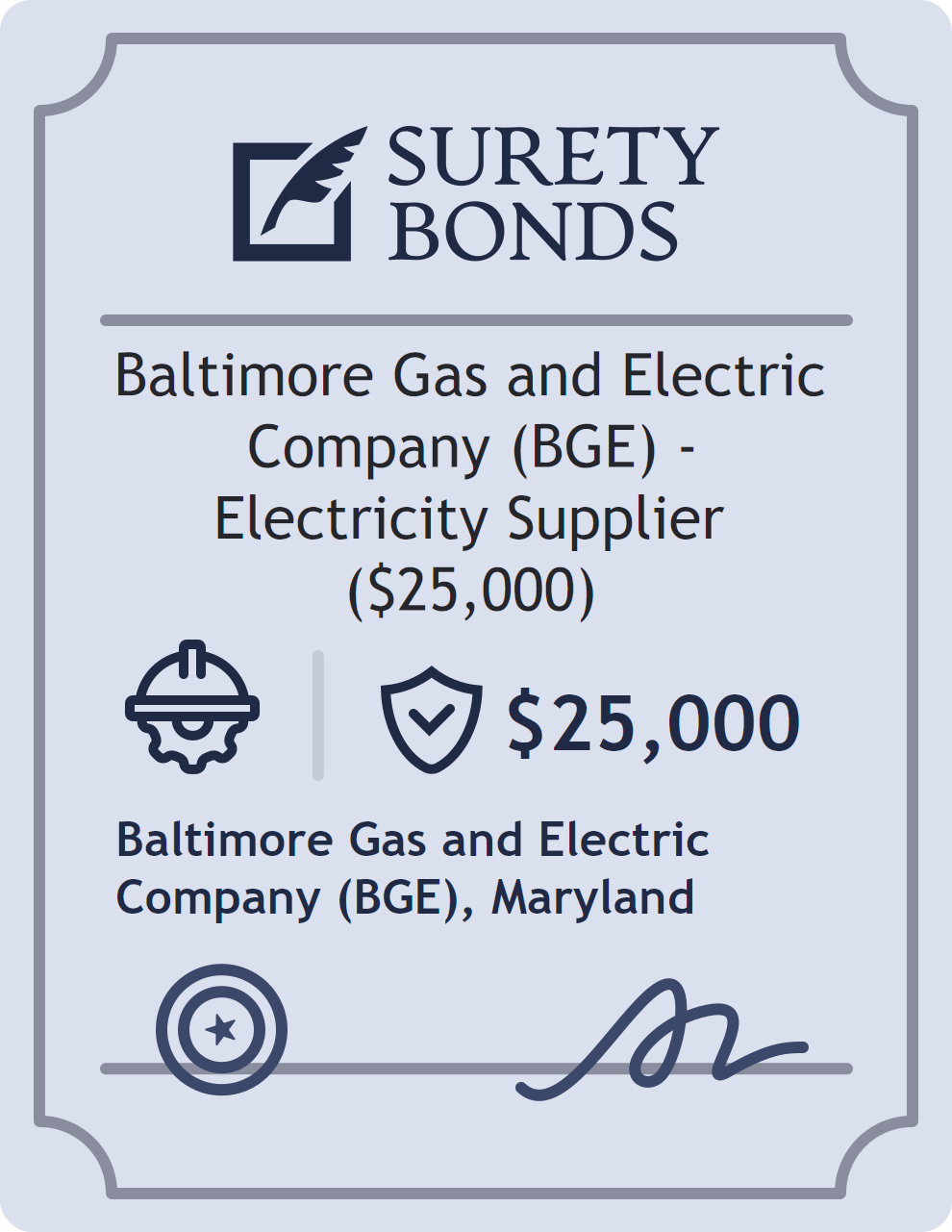 The Baltimore Gas and Electric Company (BGE) – Electricity Supplier ($25,000) is classified as a Contractor Bonds with a $25,000 obligation in Maryland. Contractor Bonds are surety bonds required for individuals or businesses performing construction work. They guarantee that contractors will comply with building codes, licensing requirements, and contractual obligations. The bond provides financial protection to property owners and the public in cases of poor workmanship, regulatory violations, or unfinished work. The surety reviews financial strength, compliance history, and indemnity support before approving the obligation. Maintaining uninterrupted coverage for the entire 1 Year term is essential; lapses can trigger penalties, contract defaults, or license suspension in Maryland. Underwriters typically request financial statements, references, and proof of licensing before quoting terms so they can evaluate repayment capacity. Throughout the bond term, the principal must maintain accurate books, respond to regulator inquiries, and remediate any complaints to prevent a claim. Many authorities in Maryland also require renewal certificates 30 to 60 days in advance, and failure to provide proof can halt permitting or bid submissions. The $25,000 limit demonstrates to customers, partners, and oversight agencies that the bonded party maintains a reliable, surety-backed source of funds dedicated to ongoing compliance. The obligee for this bond is Baltimore Gas and Electric Company (BGE).