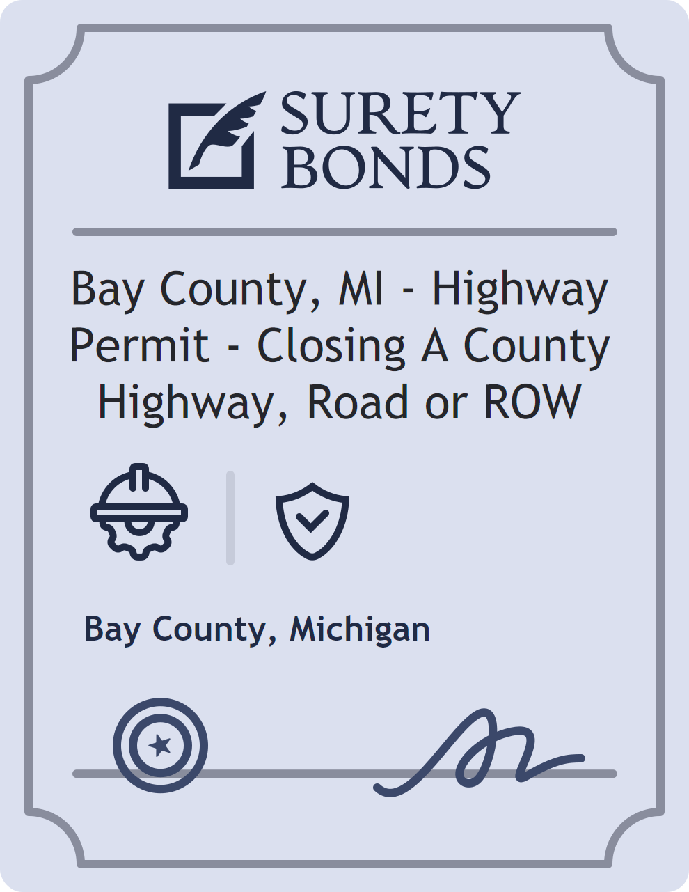 The Bay County, MI – Highway Permit – Closing A County Highway, Road or ROW is classified as a Contractor Bonds with a $10,000 obligation in Michigan. Contractor Bonds are surety bonds required for individuals or businesses performing construction work. They guarantee that contractors will comply with building codes, licensing requirements, and contractual obligations. The bond provides financial protection to property owners and the public in cases of poor workmanship, regulatory violations, or unfinished work. The surety reviews financial strength, compliance history, and indemnity support before approving the obligation. Maintaining uninterrupted coverage for the entire 1 Year term is essential; lapses can trigger penalties, contract defaults, or license suspension in Michigan. Underwriters typically request financial statements, references, and proof of licensing before quoting terms so they can evaluate repayment capacity. Throughout the bond term, the principal must maintain accurate books, respond to regulator inquiries, and remediate any complaints to prevent a claim. Many authorities in Michigan also require renewal certificates 30 to 60 days in advance, and failure to provide proof can halt permitting or bid submissions. The $10,000 limit demonstrates to customers, partners, and oversight agencies that the bonded party maintains a reliable, surety-backed source of funds dedicated to ongoing compliance. The obligee for this bond is Bay County.