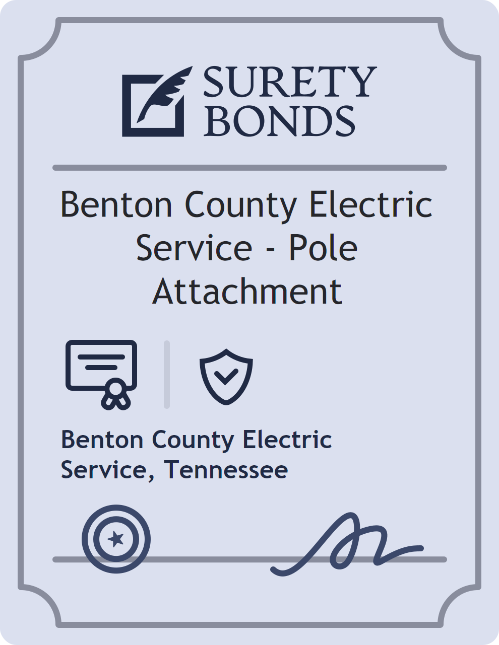 The Benton County Electric Service – Pole Attachment is classified as a Professional License Bonds with a $10,000 obligation in Tennessee. Professional License Bonds are surety bonds required for licensed professionals across various industries. They guarantee compliance with licensing laws and ethical standards, protecting clients and regulatory bodies from harm. The surety reviews financial strength, compliance history, and indemnity support before approving the obligation. Maintaining uninterrupted coverage for the entire 1 Year term is essential; lapses can trigger penalties, contract defaults, or license suspension in Tennessee. Underwriters typically request financial statements, references, and proof of licensing before quoting terms so they can evaluate repayment capacity. Throughout the bond term, the principal must maintain accurate books, respond to regulator inquiries, and remediate any complaints to prevent a claim. Many authorities in Tennessee also require renewal certificates 30 to 60 days in advance, and failure to provide proof can halt permitting or bid submissions. The $10,000 limit demonstrates to customers, partners, and oversight agencies that the bonded party maintains a reliable, surety-backed source of funds dedicated to ongoing compliance. The obligee for this bond is Benton County Electric Service.
