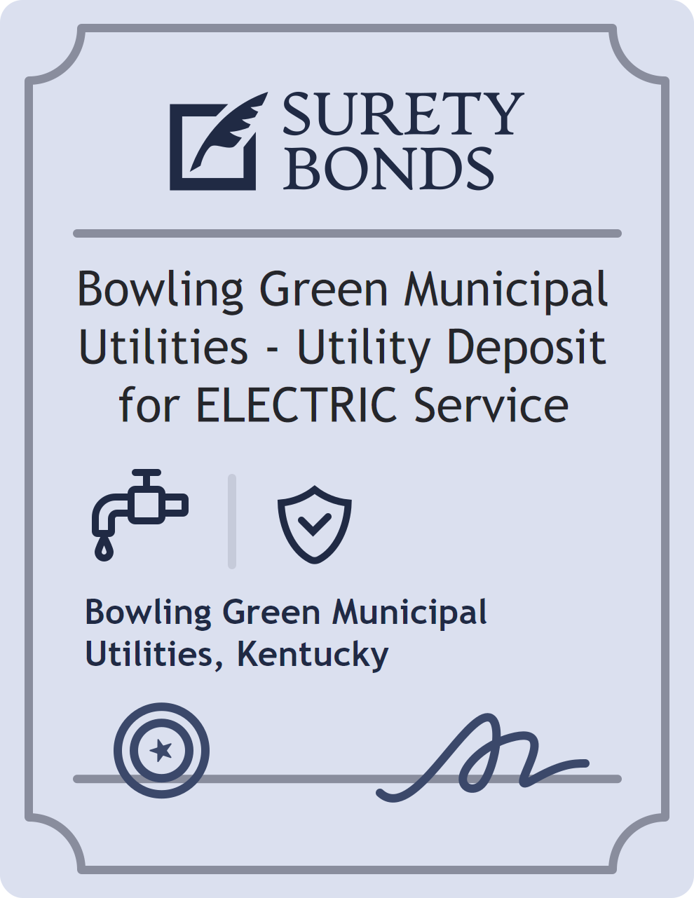 The Bowling Green Municipal Utilities – Utility Deposit for ELECTRIC Service is a $10,000 surety bond required in Kentucky. It provides a financial guarantee that the bonded party will satisfy all statutory and contractual obligations related to this bond type. The surety reviews financial strength, compliance history, and indemnity support before approving the obligation. Maintaining uninterrupted coverage for the entire 1 Year term is essential; lapses can trigger penalties, contract defaults, or license suspension in Kentucky. Underwriters typically request financial statements, references, and proof of licensing before quoting terms so they can evaluate repayment capacity. Throughout the bond term, the principal must maintain accurate books, respond to regulator inquiries, and remediate any complaints to prevent a claim. Many authorities in Kentucky also require renewal certificates 30 to 60 days in advance, and failure to provide proof can halt permitting or bid submissions. The $10,000 limit demonstrates to customers, partners, and oversight agencies that the bonded party maintains a reliable, surety-backed source of funds dedicated to ongoing compliance. The obligee for this bond is Bowling Green Municipal Utilities.