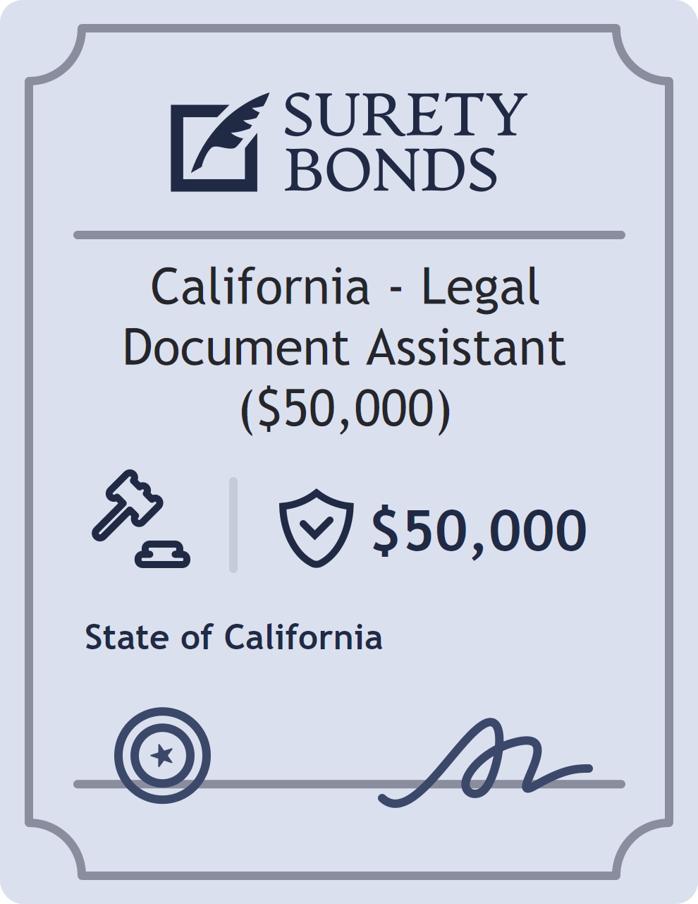 The California – Legal Document Assistant ($50,000) is classified as a Legal Bonds with a $50,000 obligation in California. Legal Bonds are surety bonds associated with court proceedings and legal obligations. They guarantee compliance with court orders, protect parties in litigation, and ensure that fiduciaries perform their duties in accordance with the law. The surety reviews financial strength, compliance history, and indemnity support before approving the obligation. Maintaining uninterrupted coverage for the entire 1 Year term is essential; lapses can trigger penalties, contract defaults, or license suspension in California. Underwriters typically request financial statements, references, and proof of licensing before quoting terms so they can evaluate repayment capacity. Throughout the bond term, the principal must maintain accurate books, respond to regulator inquiries, and remediate any complaints to prevent a claim. Many authorities in California also require renewal certificates 30 to 60 days in advance, and failure to provide proof can halt permitting or bid submissions. The $50,000 limit demonstrates to customers, partners, and oversight agencies that the bonded party maintains a reliable, surety-backed source of funds dedicated to ongoing compliance. The obligee for this bond is State of California.