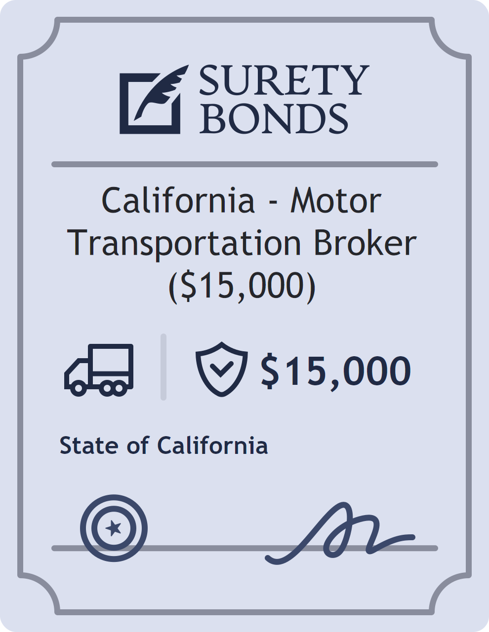 The California – Motor Transportation Broker ($15,000) is a $15,000 surety bond required in California. It provides a financial guarantee that the bonded party will satisfy all statutory and contractual obligations related to this bond type. The surety reviews financial strength, compliance history, and indemnity support before approving the obligation. Maintaining uninterrupted coverage for the entire 1 Year term is essential; lapses can trigger penalties, contract defaults, or license suspension in California. Underwriters typically request financial statements, references, and proof of licensing before quoting terms so they can evaluate repayment capacity. Throughout the bond term, the principal must maintain accurate books, respond to regulator inquiries, and remediate any complaints to prevent a claim. Many authorities in California also require renewal certificates 30 to 60 days in advance, and failure to provide proof can halt permitting or bid submissions. The $15,000 limit demonstrates to customers, partners, and oversight agencies that the bonded party maintains a reliable, surety-backed source of funds dedicated to ongoing compliance. The obligee for this bond is State of California.