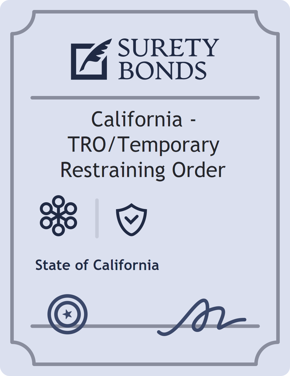 The California – TRO/Temporary Restraining Order is classified as a Miscellaneous Bonds with a $10,000 obligation in California. Miscellaneous Bonds cover a wide range of non-standard surety bond requirements. They act as financial protection in cases where state or federal regulations require assurance of compliance and ethical conduct. The surety reviews financial strength, compliance history, and indemnity support before approving the obligation. Maintaining uninterrupted coverage for the entire 1 Year term is essential; lapses can trigger penalties, contract defaults, or license suspension in California. Underwriters typically request financial statements, references, and proof of licensing before quoting terms so they can evaluate repayment capacity. Throughout the bond term, the principal must maintain accurate books, respond to regulator inquiries, and remediate any complaints to prevent a claim. Many authorities in California also require renewal certificates 30 to 60 days in advance, and failure to provide proof can halt permitting or bid submissions. The $10,000 limit demonstrates to customers, partners, and oversight agencies that the bonded party maintains a reliable, surety-backed source of funds dedicated to ongoing compliance. The obligee for this bond is State of California.