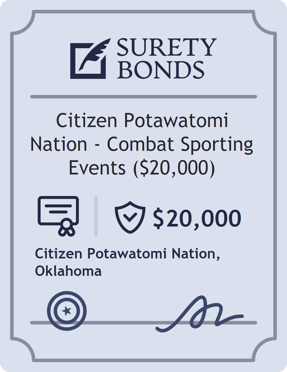 The Citizen Potawatomi Nation – Combat Sporting Events ($20,000) is classified as a Professional License Bonds with a $20,000 obligation in Oklahoma. Professional License Bonds are surety bonds required for licensed professionals across various industries. They guarantee compliance with licensing laws and ethical standards, protecting clients and regulatory bodies from harm. The surety reviews financial strength, compliance history, and indemnity support before approving the obligation. Maintaining uninterrupted coverage for the entire 1 Year term is essential; lapses can trigger penalties, contract defaults, or license suspension in Oklahoma. Underwriters typically request financial statements, references, and proof of licensing before quoting terms so they can evaluate repayment capacity. Throughout the bond term, the principal must maintain accurate books, respond to regulator inquiries, and remediate any complaints to prevent a claim. Many authorities in Oklahoma also require renewal certificates 30 to 60 days in advance, and failure to provide proof can halt permitting or bid submissions. The $20,000 limit demonstrates to customers, partners, and oversight agencies that the bonded party maintains a reliable, surety-backed source of funds dedicated to ongoing compliance. The obligee for this bond is Citizen Potawatomi Nation.