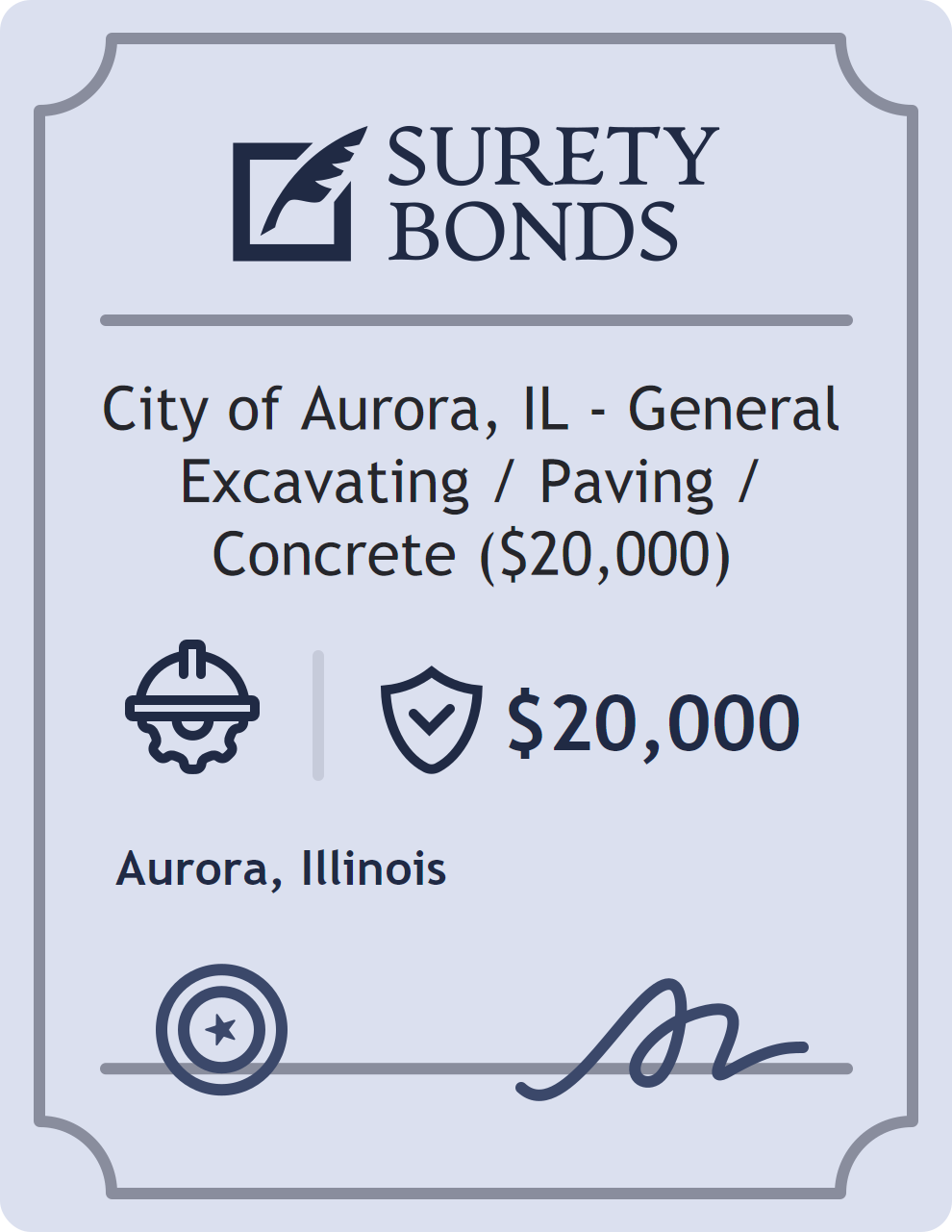 The City of Aurora, IL – General Excavating / Paving / Concrete ($20,000) is classified as a Contractor Bonds with a $20,000 obligation in Illinois. Contractor Bonds are surety bonds required for individuals or businesses performing construction work. They guarantee that contractors will comply with building codes, licensing requirements, and contractual obligations. The bond provides financial protection to property owners and the public in cases of poor workmanship, regulatory violations, or unfinished work. The surety reviews financial strength, compliance history, and indemnity support before approving the obligation. Maintaining uninterrupted coverage for the entire 1 Year term is essential; lapses can trigger penalties, contract defaults, or license suspension in Illinois. Underwriters typically request financial statements, references, and proof of licensing before quoting terms so they can evaluate repayment capacity. Throughout the bond term, the principal must maintain accurate books, respond to regulator inquiries, and remediate any complaints to prevent a claim. Many authorities in Illinois also require renewal certificates 30 to 60 days in advance, and failure to provide proof can halt permitting or bid submissions. The $20,000 limit demonstrates to customers, partners, and oversight agencies that the bonded party maintains a reliable, surety-backed source of funds dedicated to ongoing compliance. The obligee for this bond is Aurora.
