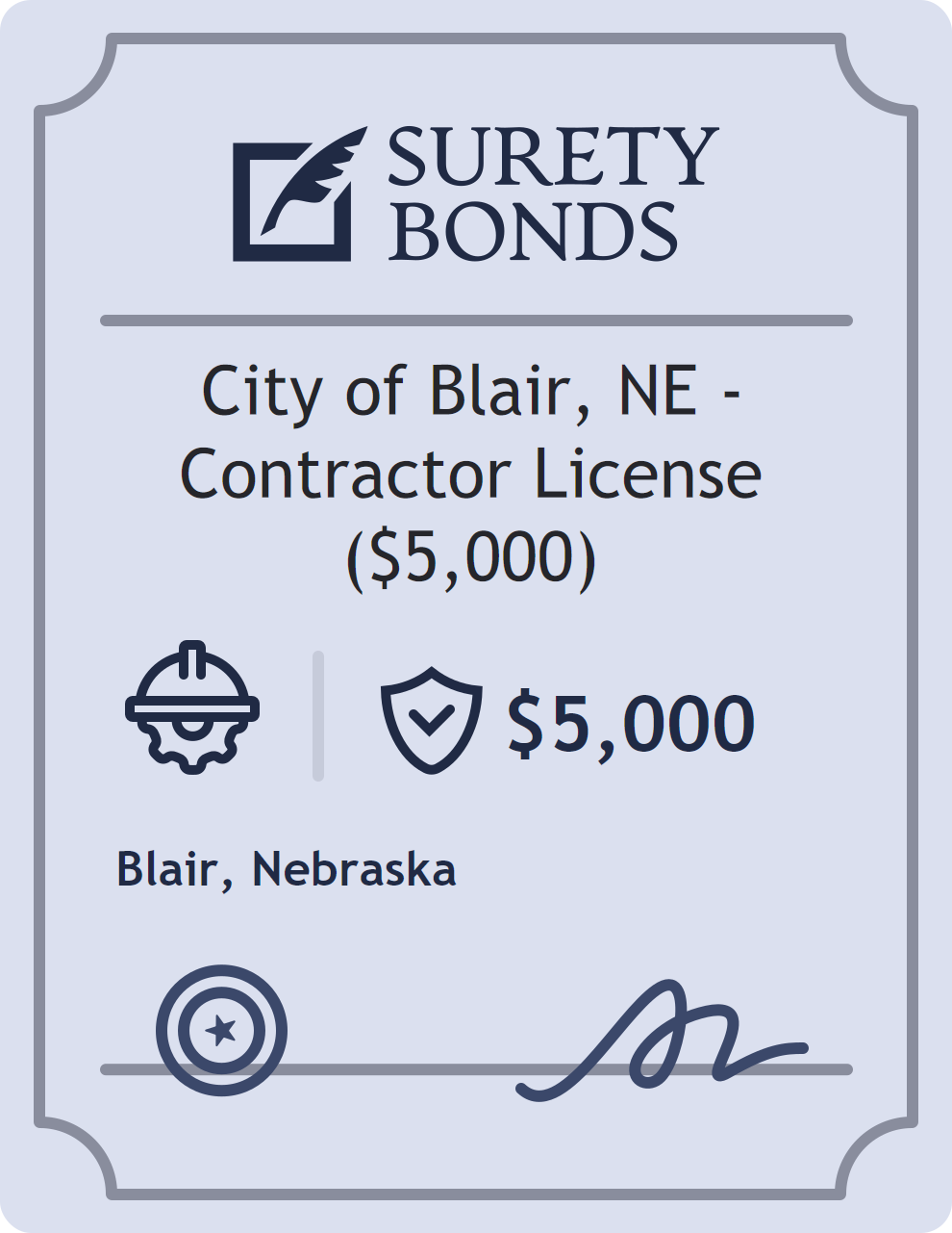 The City of Blair, NE – Contractor License ($5,000) is classified as a Contractor Bonds with a $5,000 obligation in Nebraska. Contractor Bonds are surety bonds required for individuals or businesses performing construction work. They guarantee that contractors will comply with building codes, licensing requirements, and contractual obligations. The bond provides financial protection to property owners and the public in cases of poor workmanship, regulatory violations, or unfinished work. The surety reviews financial strength, compliance history, and indemnity support before approving the obligation. Maintaining uninterrupted coverage for the entire 1 Year term is essential; lapses can trigger penalties, contract defaults, or license suspension in Nebraska. Underwriters typically request financial statements, references, and proof of licensing before quoting terms so they can evaluate repayment capacity. Throughout the bond term, the principal must maintain accurate books, respond to regulator inquiries, and remediate any complaints to prevent a claim. Many authorities in Nebraska also require renewal certificates 30 to 60 days in advance, and failure to provide proof can halt permitting or bid submissions. The $5,000 limit demonstrates to customers, partners, and oversight agencies that the bonded party maintains a reliable, surety-backed source of funds dedicated to ongoing compliance. The obligee for this bond is Blair.