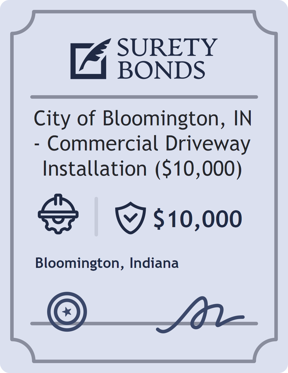 The City of Bloomington, IN – Commercial Driveway Installation ($10,000) is classified as a Contractor Bonds with a $10,000 obligation in Indiana. Contractor Bonds are surety bonds required for individuals or businesses performing construction work. They guarantee that contractors will comply with building codes, licensing requirements, and contractual obligations. The bond provides financial protection to property owners and the public in cases of poor workmanship, regulatory violations, or unfinished work. The surety reviews financial strength, compliance history, and indemnity support before approving the obligation. Maintaining uninterrupted coverage for the entire 1 Year term is essential; lapses can trigger penalties, contract defaults, or license suspension in Indiana. Underwriters typically request financial statements, references, and proof of licensing before quoting terms so they can evaluate repayment capacity. Throughout the bond term, the principal must maintain accurate books, respond to regulator inquiries, and remediate any complaints to prevent a claim. Many authorities in Indiana also require renewal certificates 30 to 60 days in advance, and failure to provide proof can halt permitting or bid submissions. The $10,000 limit demonstrates to customers, partners, and oversight agencies that the bonded party maintains a reliable, surety-backed source of funds dedicated to ongoing compliance. The obligee for this bond is Bloomington.