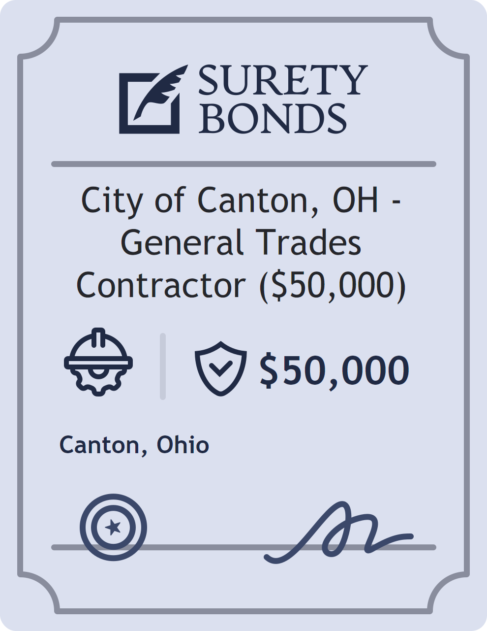 The City of Canton, OH – General Trades Contractor ($50,000) is classified as a Contractor Bonds with a $50,000 obligation in Ohio. Contractor Bonds are surety bonds required for individuals or businesses performing construction work. They guarantee that contractors will comply with building codes, licensing requirements, and contractual obligations. The bond provides financial protection to property owners and the public in cases of poor workmanship, regulatory violations, or unfinished work. The surety reviews financial strength, compliance history, and indemnity support before approving the obligation. Maintaining uninterrupted coverage for the entire 1 Year term is essential; lapses can trigger penalties, contract defaults, or license suspension in Ohio. Underwriters typically request financial statements, references, and proof of licensing before quoting terms so they can evaluate repayment capacity. Throughout the bond term, the principal must maintain accurate books, respond to regulator inquiries, and remediate any complaints to prevent a claim. Many authorities in Ohio also require renewal certificates 30 to 60 days in advance, and failure to provide proof can halt permitting or bid submissions. The $50,000 limit demonstrates to customers, partners, and oversight agencies that the bonded party maintains a reliable, surety-backed source of funds dedicated to ongoing compliance. The obligee for this bond is Canton.