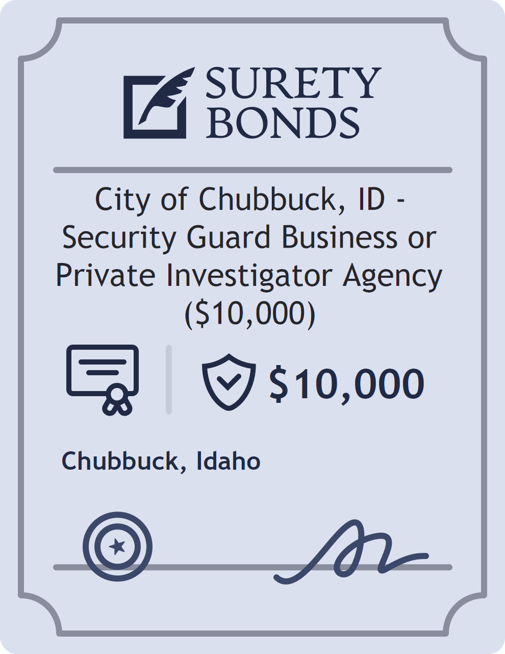 The City of Chubbuck, ID – Security Guard Business or Private Investigator Agency ($10,000) is classified as a Professional License Bonds with a $10,000 obligation in Idaho. Professional License Bonds are surety bonds required for licensed professionals across various industries. They guarantee compliance with licensing laws and ethical standards, protecting clients and regulatory bodies from harm. The surety reviews financial strength, compliance history, and indemnity support before approving the obligation. Maintaining uninterrupted coverage for the entire 1 Year term is essential; lapses can trigger penalties, contract defaults, or license suspension in Idaho. Underwriters typically request financial statements, references, and proof of licensing before quoting terms so they can evaluate repayment capacity. Throughout the bond term, the principal must maintain accurate books, respond to regulator inquiries, and remediate any complaints to prevent a claim. Many authorities in Idaho also require renewal certificates 30 to 60 days in advance, and failure to provide proof can halt permitting or bid submissions. The $10,000 limit demonstrates to customers, partners, and oversight agencies that the bonded party maintains a reliable, surety-backed source of funds dedicated to ongoing compliance. The obligee for this bond is Chubbuck.