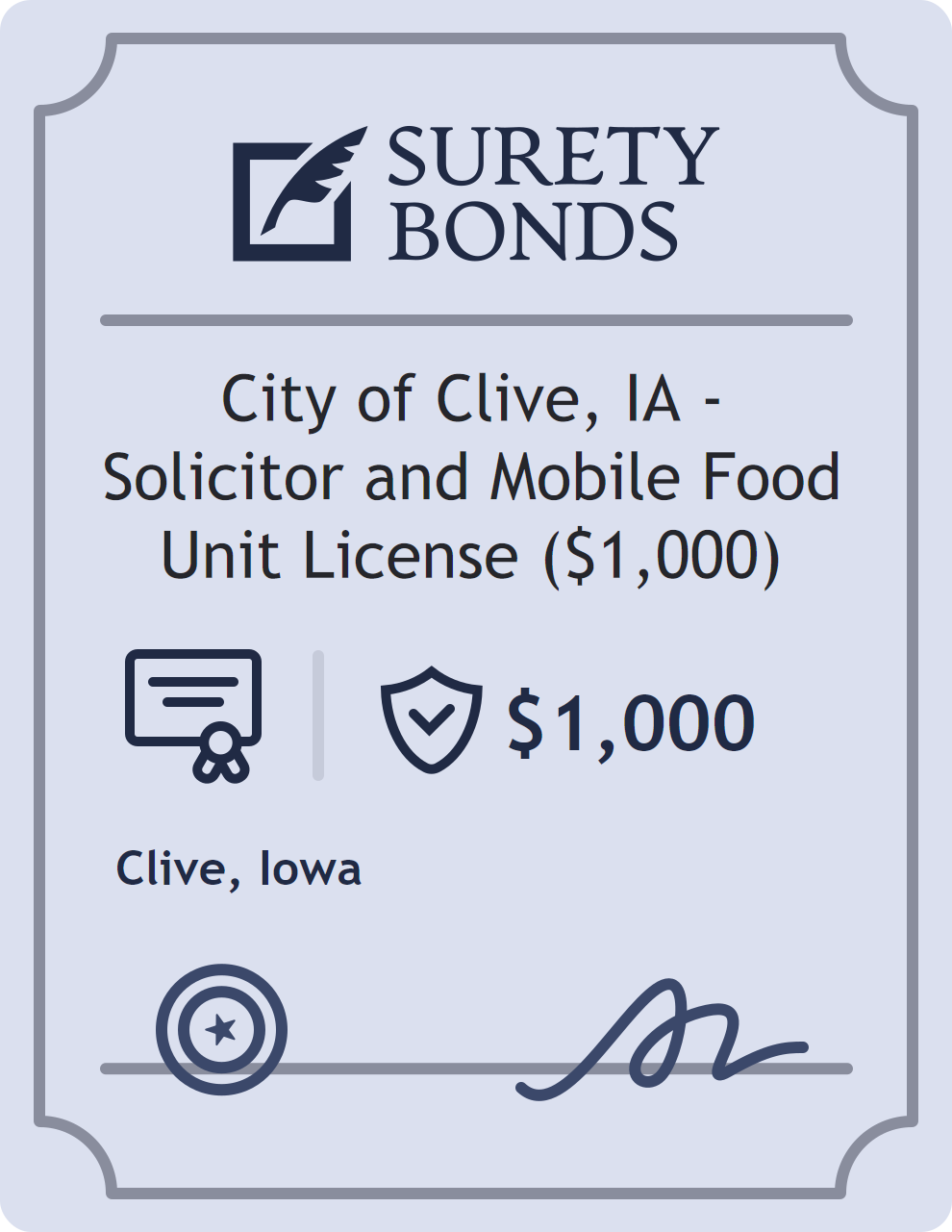 The City of Clive, IA – Solicitor and Mobile Food Unit License ($1,000) is classified as a Professional License Bonds with a $1,000 obligation in Iowa. Professional License Bonds are surety bonds required for licensed professionals across various industries. They guarantee compliance with licensing laws and ethical standards, protecting clients and regulatory bodies from harm. The surety reviews financial strength, compliance history, and indemnity support before approving the obligation. Maintaining uninterrupted coverage for the entire 1 Year term is essential; lapses can trigger penalties, contract defaults, or license suspension in Iowa. Underwriters typically request financial statements, references, and proof of licensing before quoting terms so they can evaluate repayment capacity. Throughout the bond term, the principal must maintain accurate books, respond to regulator inquiries, and remediate any complaints to prevent a claim. Many authorities in Iowa also require renewal certificates 30 to 60 days in advance, and failure to provide proof can halt permitting or bid submissions. The $1,000 limit demonstrates to customers, partners, and oversight agencies that the bonded party maintains a reliable, surety-backed source of funds dedicated to ongoing compliance. The obligee for this bond is Clive.