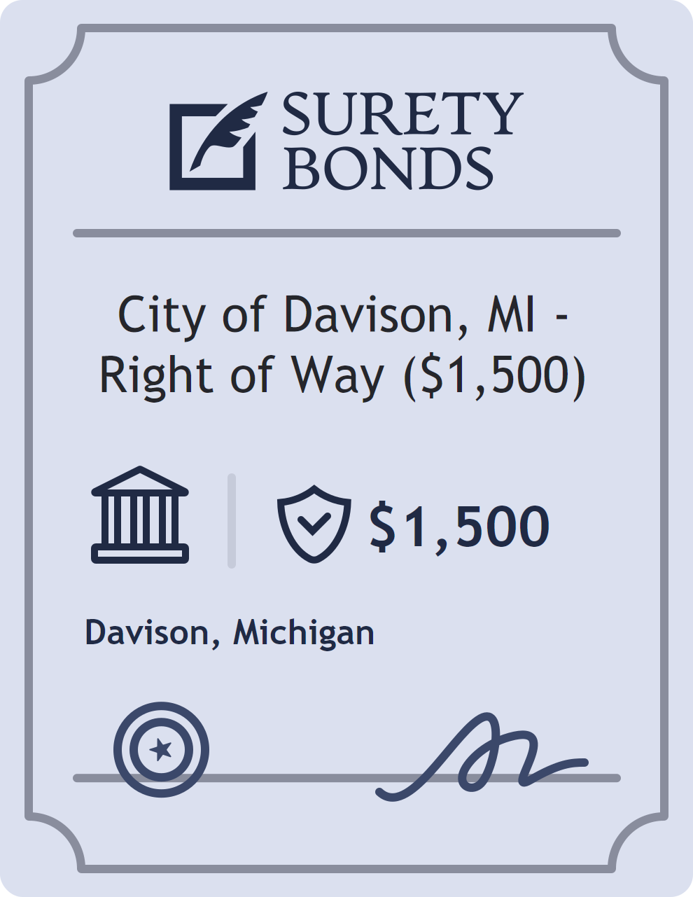 The City of Davison, MI – Right of Way ($1,500) is classified as a Government/Public Official Bonds with a $1,500 obligation in Michigan. Government/Public Official Bonds are surety bonds that ensure elected and appointed officials perform their duties faithfully and in accordance with the law. These bonds provide financial protection in cases of misconduct, negligence, or misuse of authority by public officials. The surety reviews financial strength, compliance history, and indemnity support before approving the obligation. Maintaining uninterrupted coverage for the entire 1 Year term is essential; lapses can trigger penalties, contract defaults, or license suspension in Michigan. Underwriters typically request financial statements, references, and proof of licensing before quoting terms so they can evaluate repayment capacity. Throughout the bond term, the principal must maintain accurate books, respond to regulator inquiries, and remediate any complaints to prevent a claim. Many authorities in Michigan also require renewal certificates 30 to 60 days in advance, and failure to provide proof can halt permitting or bid submissions. The $1,500 limit demonstrates to customers, partners, and oversight agencies that the bonded party maintains a reliable, surety-backed source of funds dedicated to ongoing compliance. The obligee for this bond is Davison.