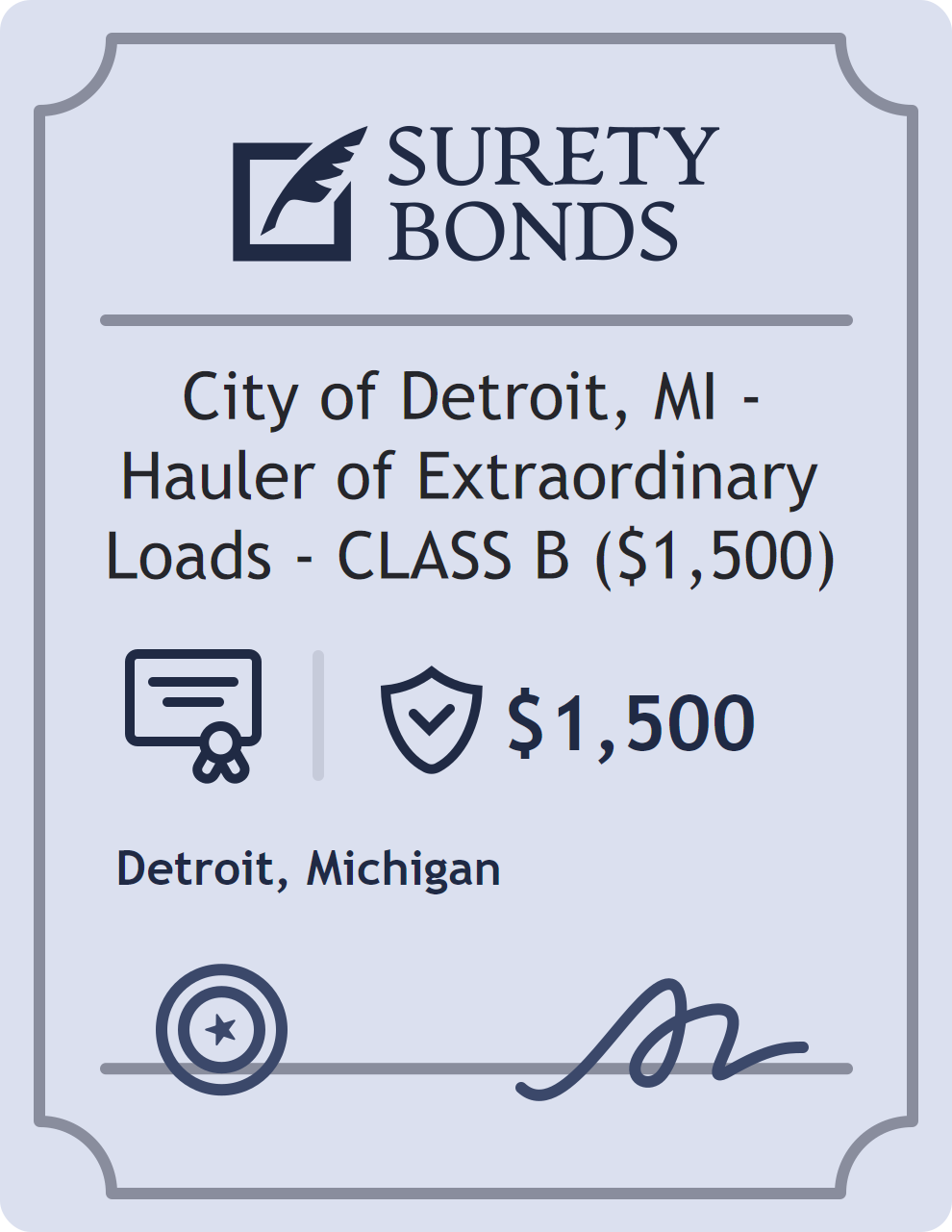 The City of Detroit, MI – Hauler of Extraordinary Loads – CLASS B ($1,500) is classified as a Professional License Bonds with a $1,500 obligation in Michigan. Professional License Bonds are surety bonds required for licensed professionals across various industries. They guarantee compliance with licensing laws and ethical standards, protecting clients and regulatory bodies from harm. The surety reviews financial strength, compliance history, and indemnity support before approving the obligation. Maintaining uninterrupted coverage for the entire 1 Year term is essential; lapses can trigger penalties, contract defaults, or license suspension in Michigan. Underwriters typically request financial statements, references, and proof of licensing before quoting terms so they can evaluate repayment capacity. Throughout the bond term, the principal must maintain accurate books, respond to regulator inquiries, and remediate any complaints to prevent a claim. Many authorities in Michigan also require renewal certificates 30 to 60 days in advance, and failure to provide proof can halt permitting or bid submissions. The $1,500 limit demonstrates to customers, partners, and oversight agencies that the bonded party maintains a reliable, surety-backed source of funds dedicated to ongoing compliance. The obligee for this bond is Detroit.