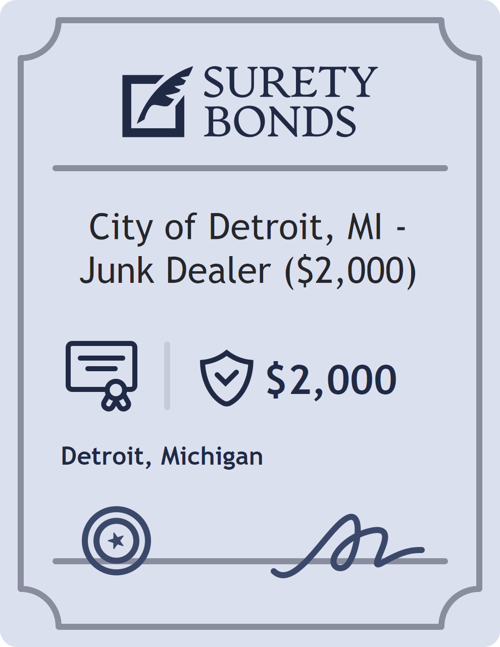 The City of Detroit, MI – Junk Dealer ($2,000) is classified as a Professional License Bonds with a $2,000 obligation in Michigan. Professional License Bonds are surety bonds required for licensed professionals across various industries. They guarantee compliance with licensing laws and ethical standards, protecting clients and regulatory bodies from harm. The surety reviews financial strength, compliance history, and indemnity support before approving the obligation. Maintaining uninterrupted coverage for the entire 1 Year term is essential; lapses can trigger penalties, contract defaults, or license suspension in Michigan. Underwriters typically request financial statements, references, and proof of licensing before quoting terms so they can evaluate repayment capacity. Throughout the bond term, the principal must maintain accurate books, respond to regulator inquiries, and remediate any complaints to prevent a claim. Many authorities in Michigan also require renewal certificates 30 to 60 days in advance, and failure to provide proof can halt permitting or bid submissions. The $2,000 limit demonstrates to customers, partners, and oversight agencies that the bonded party maintains a reliable, surety-backed source of funds dedicated to ongoing compliance. The obligee for this bond is Detroit.