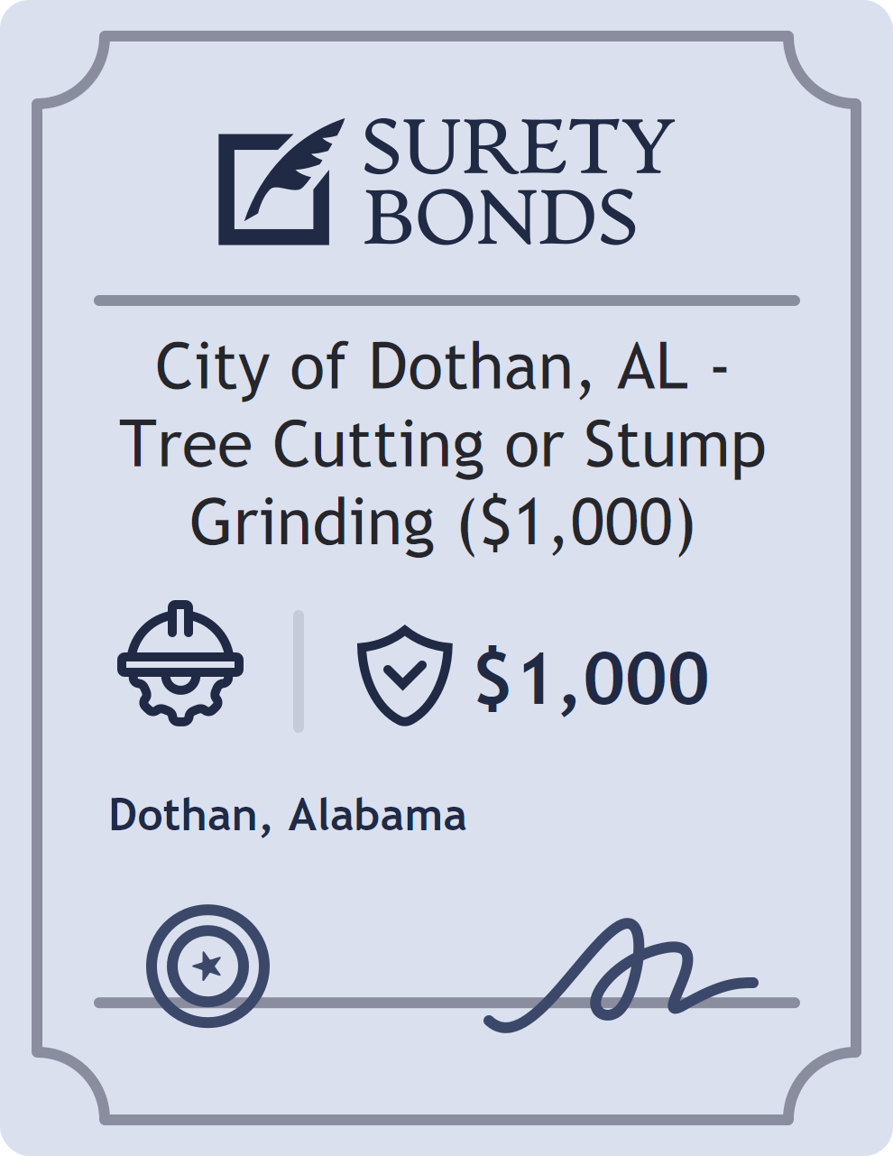 The City of Dothan, AL – Tree Cutting or Stump Grinding ($1,000) is classified as a Contractor Bonds with a $1,000 obligation in Alabama. Contractor Bonds are surety bonds required for individuals or businesses performing construction work. They guarantee that contractors will comply with building codes, licensing requirements, and contractual obligations. The bond provides financial protection to property owners and the public in cases of poor workmanship, regulatory violations, or unfinished work. The surety reviews financial strength, compliance history, and indemnity support before approving the obligation. Maintaining uninterrupted coverage for the entire 1 Year term is essential; lapses can trigger penalties, contract defaults, or license suspension in Alabama. Underwriters typically request financial statements, references, and proof of licensing before quoting terms so they can evaluate repayment capacity. Throughout the bond term, the principal must maintain accurate books, respond to regulator inquiries, and remediate any complaints to prevent a claim. Many authorities in Alabama also require renewal certificates 30 to 60 days in advance, and failure to provide proof can halt permitting or bid submissions. The $1,000 limit demonstrates to customers, partners, and oversight agencies that the bonded party maintains a reliable, surety-backed source of funds dedicated to ongoing compliance. The obligee for this bond is Dothan.