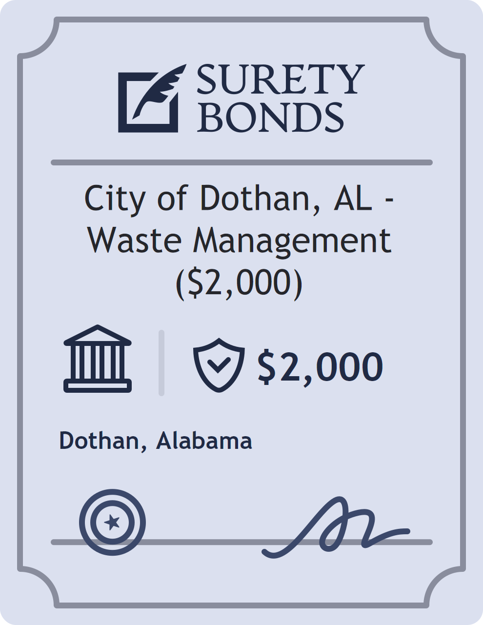 The City of Dothan, AL – Waste Management ($2,000) is classified as a Government/Public Official Bonds with a $2,000 obligation in Alabama. Government/Public Official Bonds are surety bonds that ensure elected and appointed officials perform their duties faithfully and in accordance with the law. These bonds provide financial protection in cases of misconduct, negligence, or misuse of authority by public officials. The surety reviews financial strength, compliance history, and indemnity support before approving the obligation. Maintaining uninterrupted coverage for the entire 1 Year term is essential; lapses can trigger penalties, contract defaults, or license suspension in Alabama. Underwriters typically request financial statements, references, and proof of licensing before quoting terms so they can evaluate repayment capacity. Throughout the bond term, the principal must maintain accurate books, respond to regulator inquiries, and remediate any complaints to prevent a claim. Many authorities in Alabama also require renewal certificates 30 to 60 days in advance, and failure to provide proof can halt permitting or bid submissions. The $2,000 limit demonstrates to customers, partners, and oversight agencies that the bonded party maintains a reliable, surety-backed source of funds dedicated to ongoing compliance. The obligee for this bond is Dothan.