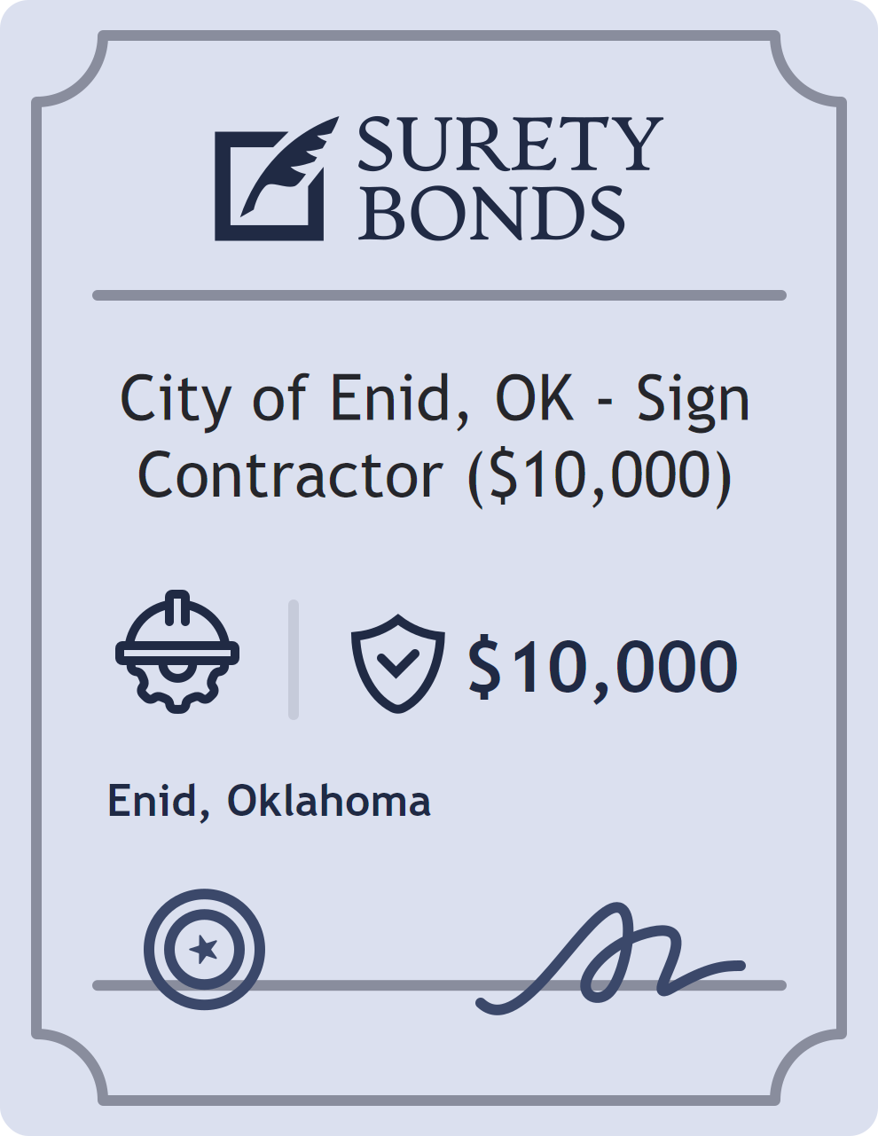 The City of Enid, OK – Sign Contractor ($10,000) is classified as a Contractor Bonds with a $10,000 obligation in Oklahoma. Contractor Bonds are surety bonds required for individuals or businesses performing construction work. They guarantee that contractors will comply with building codes, licensing requirements, and contractual obligations. The bond provides financial protection to property owners and the public in cases of poor workmanship, regulatory violations, or unfinished work. The surety reviews financial strength, compliance history, and indemnity support before approving the obligation. Maintaining uninterrupted coverage for the entire 1 Year term is essential; lapses can trigger penalties, contract defaults, or license suspension in Oklahoma. Underwriters typically request financial statements, references, and proof of licensing before quoting terms so they can evaluate repayment capacity. Throughout the bond term, the principal must maintain accurate books, respond to regulator inquiries, and remediate any complaints to prevent a claim. Many authorities in Oklahoma also require renewal certificates 30 to 60 days in advance, and failure to provide proof can halt permitting or bid submissions. The $10,000 limit demonstrates to customers, partners, and oversight agencies that the bonded party maintains a reliable, surety-backed source of funds dedicated to ongoing compliance. The obligee for this bond is Enid.