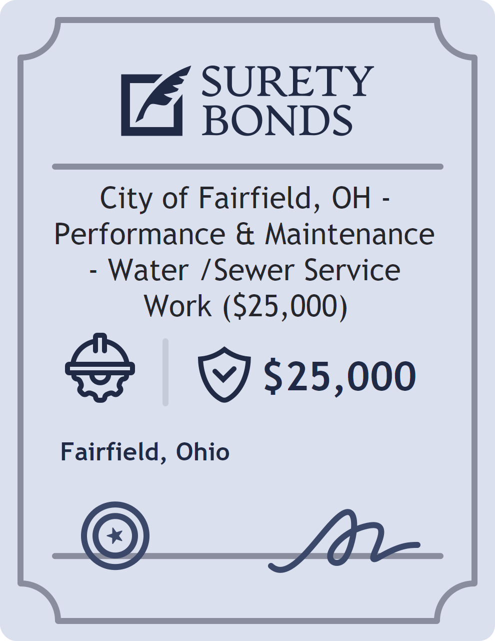 The City of Fairfield, OH – Performance & Maintenance – Water /Sewer Service Work ($25,000) is classified as a Contractor Bonds with a $25,000 obligation in Ohio. Contractor Bonds are surety bonds required for individuals or businesses performing construction work. They guarantee that contractors will comply with building codes, licensing requirements, and contractual obligations. The bond provides financial protection to property owners and the public in cases of poor workmanship, regulatory violations, or unfinished work. The surety reviews financial strength, compliance history, and indemnity support before approving the obligation. Maintaining uninterrupted coverage for the entire 1 Year term is essential; lapses can trigger penalties, contract defaults, or license suspension in Ohio. Underwriters typically request financial statements, references, and proof of licensing before quoting terms so they can evaluate repayment capacity. Throughout the bond term, the principal must maintain accurate books, respond to regulator inquiries, and remediate any complaints to prevent a claim. Many authorities in Ohio also require renewal certificates 30 to 60 days in advance, and failure to provide proof can halt permitting or bid submissions. The $25,000 limit demonstrates to customers, partners, and oversight agencies that the bonded party maintains a reliable, surety-backed source of funds dedicated to ongoing compliance. The obligee for this bond is Fairfield.