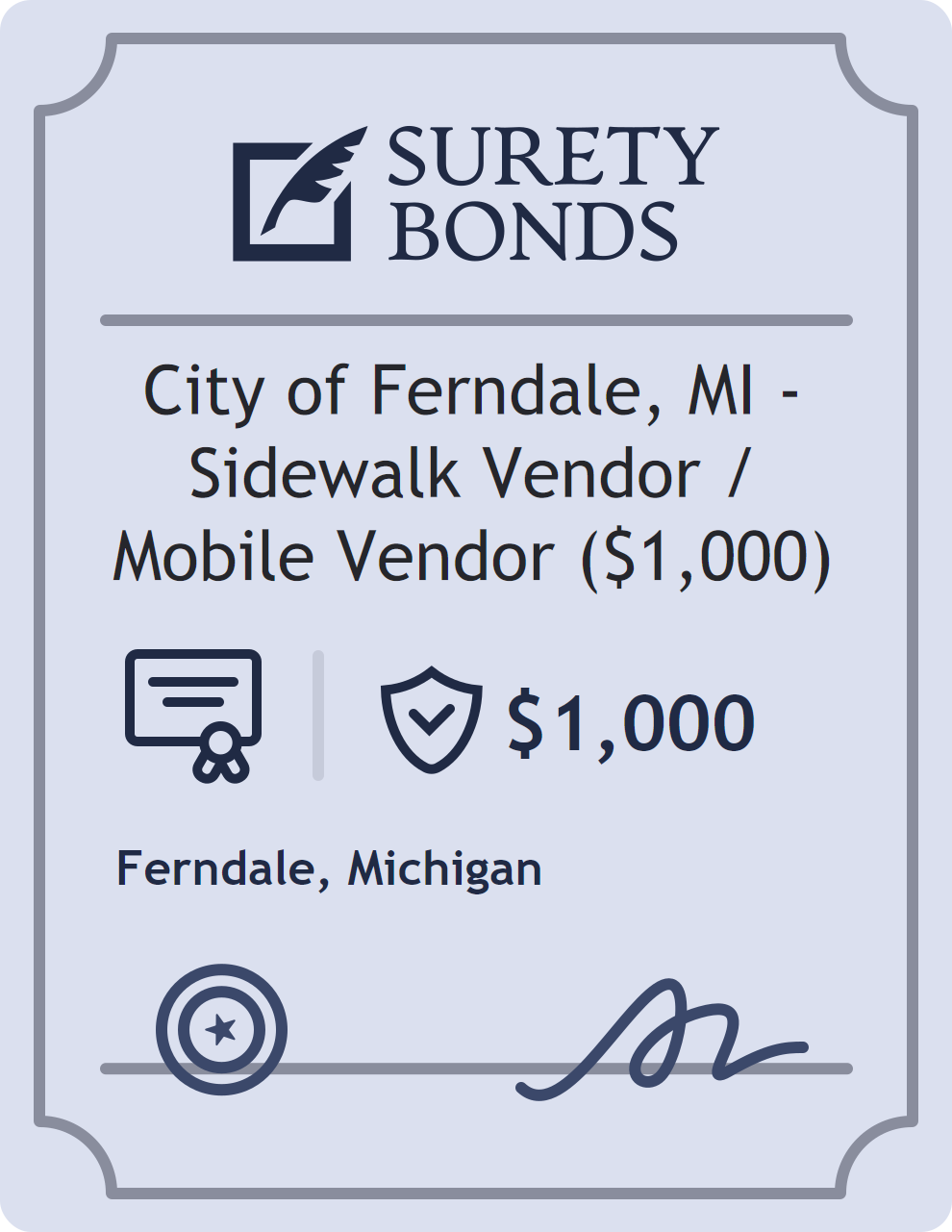 The City of Ferndale, MI – Sidewalk Vendor / Mobile Vendor ($1,000) is classified as a Professional License Bonds with a $1,000 obligation in Michigan. Professional License Bonds are surety bonds required for licensed professionals across various industries. They guarantee compliance with licensing laws and ethical standards, protecting clients and regulatory bodies from harm. The surety reviews financial strength, compliance history, and indemnity support before approving the obligation. Maintaining uninterrupted coverage for the entire 1 Year term is essential; lapses can trigger penalties, contract defaults, or license suspension in Michigan. Underwriters typically request financial statements, references, and proof of licensing before quoting terms so they can evaluate repayment capacity. Throughout the bond term, the principal must maintain accurate books, respond to regulator inquiries, and remediate any complaints to prevent a claim. Many authorities in Michigan also require renewal certificates 30 to 60 days in advance, and failure to provide proof can halt permitting or bid submissions. The $1,000 limit demonstrates to customers, partners, and oversight agencies that the bonded party maintains a reliable, surety-backed source of funds dedicated to ongoing compliance. The obligee for this bond is Ferndale.