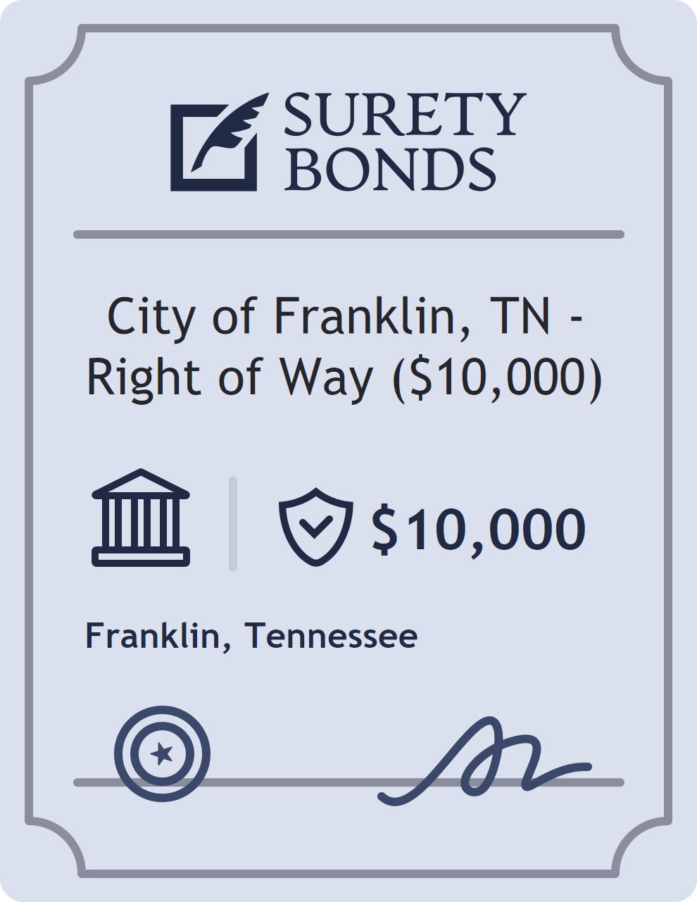 The City of Franklin, TN – Right of Way ($10,000) is classified as a Government/Public Official Bonds with a $10,000 obligation in Tennessee. Government/Public Official Bonds are surety bonds that ensure elected and appointed officials perform their duties faithfully and in accordance with the law. These bonds provide financial protection in cases of misconduct, negligence, or misuse of authority by public officials. The surety reviews financial strength, compliance history, and indemnity support before approving the obligation. Maintaining uninterrupted coverage for the entire 1 Year term is essential; lapses can trigger penalties, contract defaults, or license suspension in Tennessee. Underwriters typically request financial statements, references, and proof of licensing before quoting terms so they can evaluate repayment capacity. Throughout the bond term, the principal must maintain accurate books, respond to regulator inquiries, and remediate any complaints to prevent a claim. Many authorities in Tennessee also require renewal certificates 30 to 60 days in advance, and failure to provide proof can halt permitting or bid submissions. The $10,000 limit demonstrates to customers, partners, and oversight agencies that the bonded party maintains a reliable, surety-backed source of funds dedicated to ongoing compliance. The obligee for this bond is Franklin.