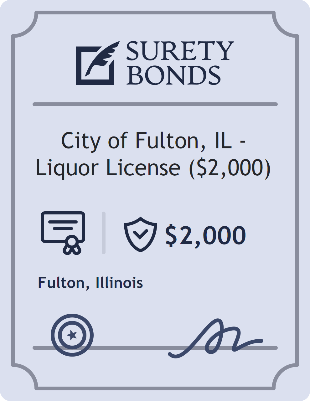 The City of Fulton, IL – Liquor License ($2,000) is classified as a Professional License Bonds with a $2,000 obligation in Illinois. Professional License Bonds are surety bonds required for licensed professionals across various industries. They guarantee compliance with licensing laws and ethical standards, protecting clients and regulatory bodies from harm. The surety reviews financial strength, compliance history, and indemnity support before approving the obligation. Maintaining uninterrupted coverage for the entire 1 Year term is essential; lapses can trigger penalties, contract defaults, or license suspension in Illinois. Underwriters typically request financial statements, references, and proof of licensing before quoting terms so they can evaluate repayment capacity. Throughout the bond term, the principal must maintain accurate books, respond to regulator inquiries, and remediate any complaints to prevent a claim. Many authorities in Illinois also require renewal certificates 30 to 60 days in advance, and failure to provide proof can halt permitting or bid submissions. The $2,000 limit demonstrates to customers, partners, and oversight agencies that the bonded party maintains a reliable, surety-backed source of funds dedicated to ongoing compliance. The obligee for this bond is Fulton.