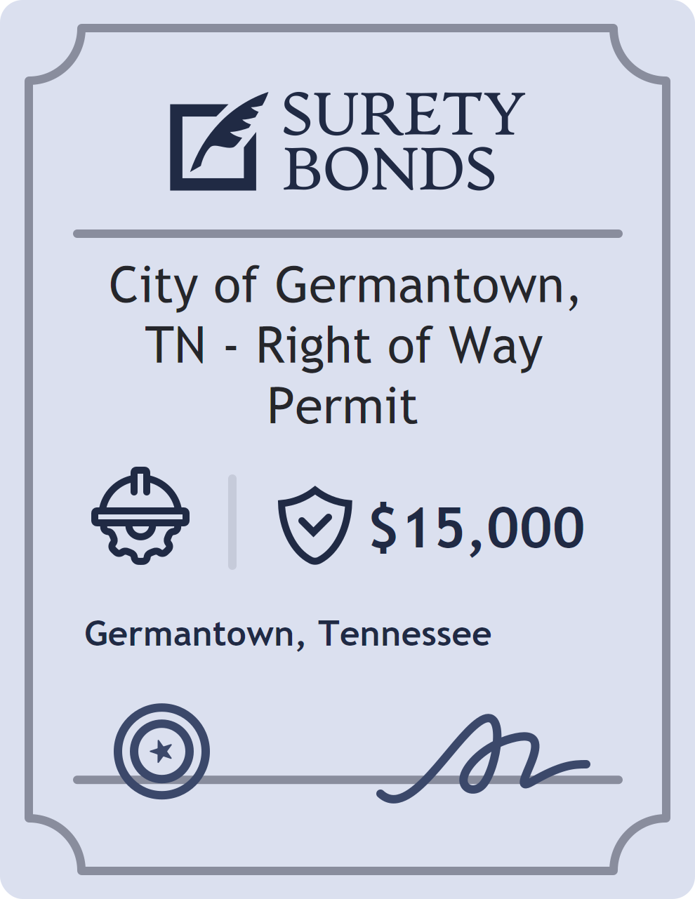 The City of Germantown, TN – Right of Way Permit is classified as a Contractor Bonds with a $15,000.00 obligation in Tennessee. Contractor Bonds are surety bonds required for individuals or businesses performing construction work. They guarantee that contractors will comply with building codes, licensing requirements, and contractual obligations. The bond provides financial protection to property owners and the public in cases of poor workmanship, regulatory violations, or unfinished work. The surety reviews financial strength, compliance history, and indemnity support before approving the obligation. Maintaining uninterrupted coverage for the entire 1 Year term is essential; lapses can trigger penalties, contract defaults, or license suspension in Tennessee. Underwriters typically request financial statements, references, and proof of licensing before quoting terms so they can evaluate repayment capacity. Throughout the bond term, the principal must maintain accurate books, respond to regulator inquiries, and remediate any complaints to prevent a claim. Many authorities in Tennessee also require renewal certificates 30 to 60 days in advance, and failure to provide proof can halt permitting or bid submissions. The $15,000.00 limit demonstrates to customers, partners, and oversight agencies that the bonded party maintains a reliable, surety-backed source of funds dedicated to ongoing compliance. The obligee for this bond is Germantown.