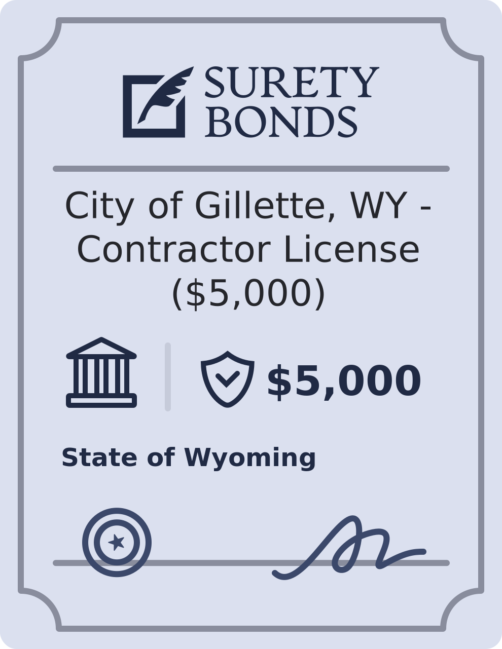 The City of Gillette, WY – Contractor License ($5,000) is classified as a Government/Public Official Bonds with a $5,000 obligation in Wyoming. Government/Public Official Bonds are surety bonds that ensure elected and appointed officials perform their duties faithfully and in accordance with the law. These bonds provide financial protection in cases of misconduct, negligence, or misuse of authority by public officials. The surety reviews financial strength, compliance history, and indemnity support before approving the obligation. Maintaining uninterrupted coverage for the entire 1 Year term is essential; lapses can trigger penalties, contract defaults, or license suspension in Wyoming. Underwriters typically request financial statements, references, and proof of licensing before quoting terms so they can evaluate repayment capacity. Throughout the bond term, the principal must maintain accurate books, respond to regulator inquiries, and remediate any complaints to prevent a claim. Many authorities in Wyoming also require renewal certificates 30 to 60 days in advance, and failure to provide proof can halt permitting or bid submissions. The $5,000 limit demonstrates to customers, partners, and oversight agencies that the bonded party maintains a reliable, surety-backed source of funds dedicated to ongoing compliance.