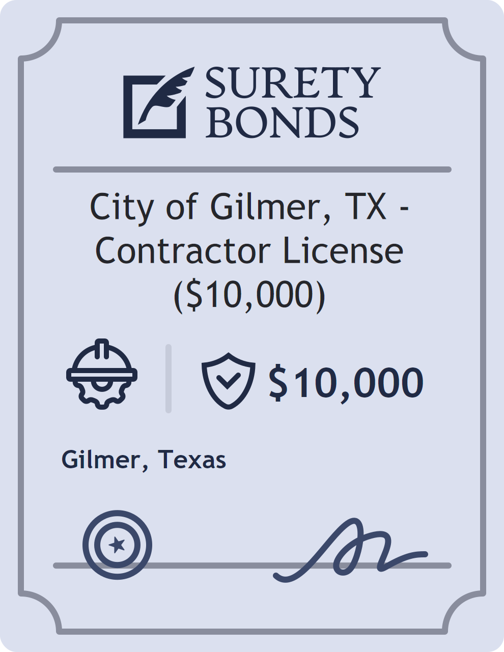 The City of Gilmer, TX – Contractor License ($10,000) is classified as a Contractor Bonds with a $10,000 obligation in Texas. Contractor Bonds are surety bonds required for individuals or businesses performing construction work. They guarantee that contractors will comply with building codes, licensing requirements, and contractual obligations. The bond provides financial protection to property owners and the public in cases of poor workmanship, regulatory violations, or unfinished work. The surety reviews financial strength, compliance history, and indemnity support before approving the obligation. Maintaining uninterrupted coverage for the entire 1 Year term is essential; lapses can trigger penalties, contract defaults, or license suspension in Texas. Underwriters typically request financial statements, references, and proof of licensing before quoting terms so they can evaluate repayment capacity. Throughout the bond term, the principal must maintain accurate books, respond to regulator inquiries, and remediate any complaints to prevent a claim. Many authorities in Texas also require renewal certificates 30 to 60 days in advance, and failure to provide proof can halt permitting or bid submissions. The $10,000 limit demonstrates to customers, partners, and oversight agencies that the bonded party maintains a reliable, surety-backed source of funds dedicated to ongoing compliance. The obligee for this bond is Gilmer.