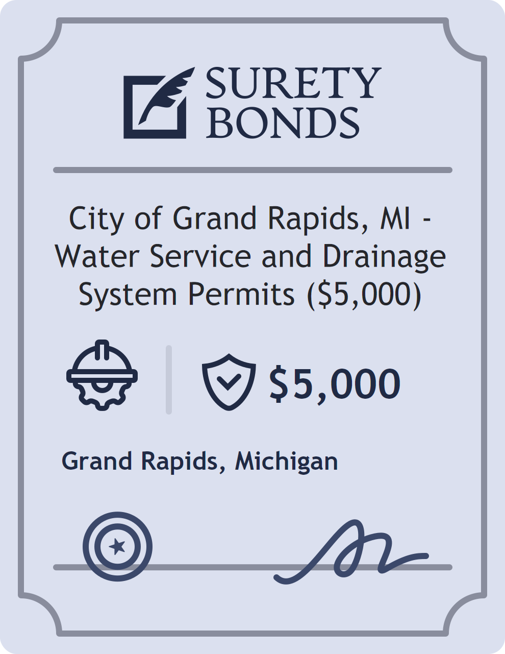 The City of Grand Rapids, MI – Water Service and Drainage System Permits ($5,000) is classified as a Contractor Bonds with a $5,000 obligation in Michigan. Contractor Bonds are surety bonds required for individuals or businesses performing construction work. They guarantee that contractors will comply with building codes, licensing requirements, and contractual obligations. The bond provides financial protection to property owners and the public in cases of poor workmanship, regulatory violations, or unfinished work. The surety reviews financial strength, compliance history, and indemnity support before approving the obligation. Maintaining uninterrupted coverage for the entire 1 Year term is essential; lapses can trigger penalties, contract defaults, or license suspension in Michigan. Underwriters typically request financial statements, references, and proof of licensing before quoting terms so they can evaluate repayment capacity. Throughout the bond term, the principal must maintain accurate books, respond to regulator inquiries, and remediate any complaints to prevent a claim. Many authorities in Michigan also require renewal certificates 30 to 60 days in advance, and failure to provide proof can halt permitting or bid submissions. The $5,000 limit demonstrates to customers, partners, and oversight agencies that the bonded party maintains a reliable, surety-backed source of funds dedicated to ongoing compliance. The obligee for this bond is Grand Rapids.