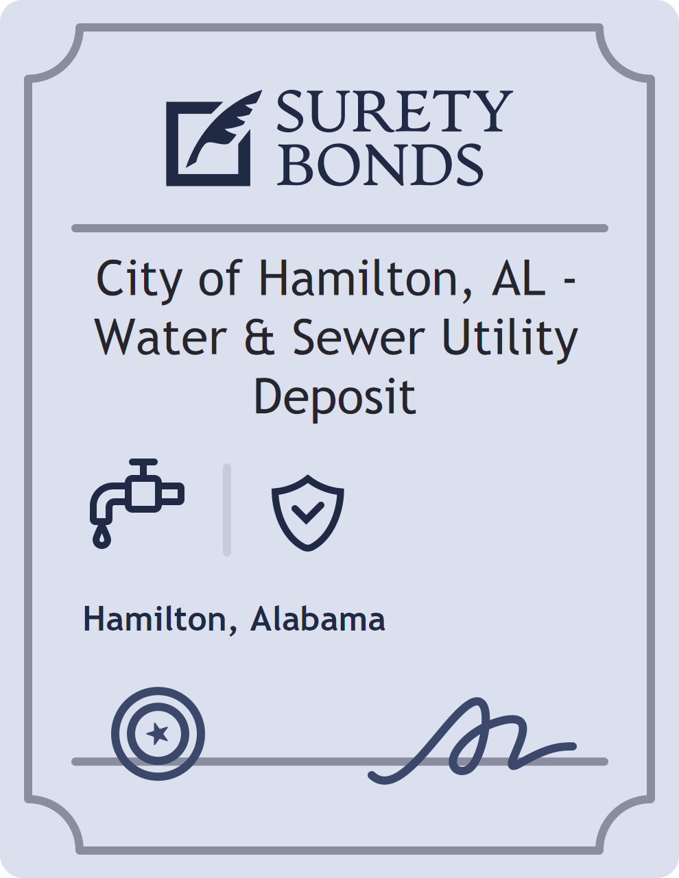 The City of Hamilton, AL – Water & Sewer Utility Deposit is a $10,000 surety bond required in Alabama. It provides a financial guarantee that the bonded party will satisfy all statutory and contractual obligations related to this bond type. The surety reviews financial strength, compliance history, and indemnity support before approving the obligation. Maintaining uninterrupted coverage for the entire 1 Year term is essential; lapses can trigger penalties, contract defaults, or license suspension in Alabama. Underwriters typically request financial statements, references, and proof of licensing before quoting terms so they can evaluate repayment capacity. Throughout the bond term, the principal must maintain accurate books, respond to regulator inquiries, and remediate any complaints to prevent a claim. Many authorities in Alabama also require renewal certificates 30 to 60 days in advance, and failure to provide proof can halt permitting or bid submissions. The $10,000 limit demonstrates to customers, partners, and oversight agencies that the bonded party maintains a reliable, surety-backed source of funds dedicated to ongoing compliance. The obligee for this bond is Hamilton.
