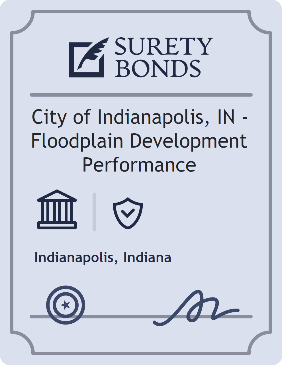The City of Indianapolis, IN – Floodplain Development Performance is classified as a Government/Public Official Bonds with a $10,000 obligation in Indiana. Government/Public Official Bonds are surety bonds that ensure elected and appointed officials perform their duties faithfully and in accordance with the law. These bonds provide financial protection in cases of misconduct, negligence, or misuse of authority by public officials. The surety reviews financial strength, compliance history, and indemnity support before approving the obligation. Maintaining uninterrupted coverage for the entire 1 Year term is essential; lapses can trigger penalties, contract defaults, or license suspension in Indiana. Underwriters typically request financial statements, references, and proof of licensing before quoting terms so they can evaluate repayment capacity. Throughout the bond term, the principal must maintain accurate books, respond to regulator inquiries, and remediate any complaints to prevent a claim. Many authorities in Indiana also require renewal certificates 30 to 60 days in advance, and failure to provide proof can halt permitting or bid submissions. The $10,000 limit demonstrates to customers, partners, and oversight agencies that the bonded party maintains a reliable, surety-backed source of funds dedicated to ongoing compliance. The obligee for this bond is Indianapolis.
