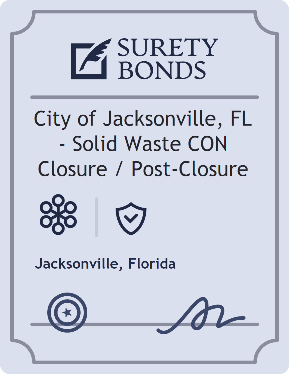 The City of Jacksonville, FL – Solid Waste CON Closure / Post-Closure is classified as a Miscellaneous Bonds with a $10,000 obligation in Florida. Miscellaneous Bonds cover a wide range of non-standard surety bond requirements. They act as financial protection in cases where state or federal regulations require assurance of compliance and ethical conduct. The surety reviews financial strength, compliance history, and indemnity support before approving the obligation. Maintaining uninterrupted coverage for the entire 1 Year term is essential; lapses can trigger penalties, contract defaults, or license suspension in Florida. Underwriters typically request financial statements, references, and proof of licensing before quoting terms so they can evaluate repayment capacity. Throughout the bond term, the principal must maintain accurate books, respond to regulator inquiries, and remediate any complaints to prevent a claim. Many authorities in Florida also require renewal certificates 30 to 60 days in advance, and failure to provide proof can halt permitting or bid submissions. The $10,000 limit demonstrates to customers, partners, and oversight agencies that the bonded party maintains a reliable, surety-backed source of funds dedicated to ongoing compliance. The obligee for this bond is Jacksonville.