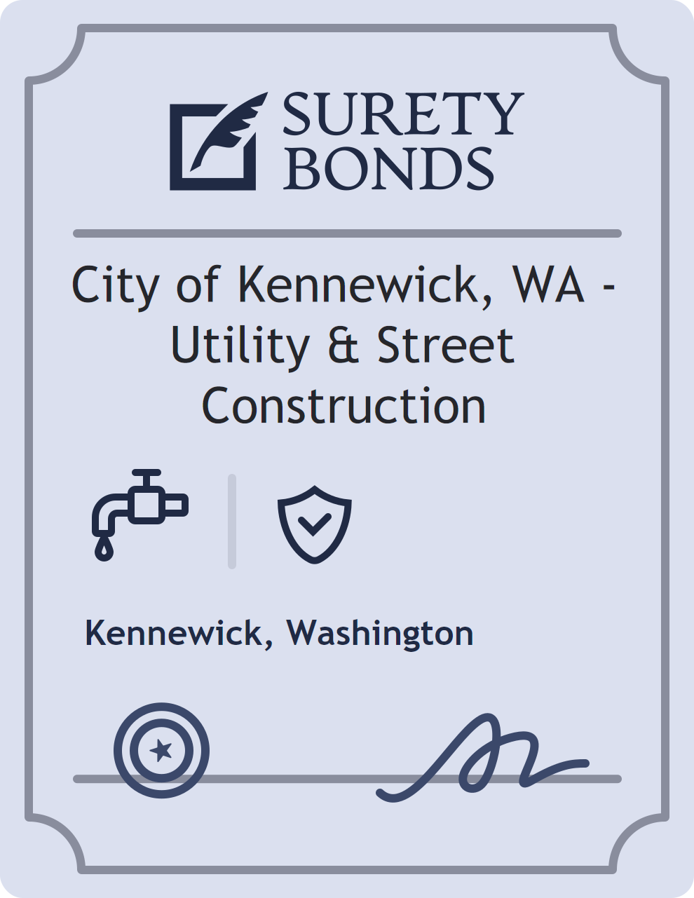The City of Kennewick, WA – Utility & Street Construction is a $10,000 surety bond required in Washington. It provides a financial guarantee that the bonded party will satisfy all statutory and contractual obligations related to this bond type. The surety reviews financial strength, compliance history, and indemnity support before approving the obligation. Maintaining uninterrupted coverage for the entire 1 Year term is essential; lapses can trigger penalties, contract defaults, or license suspension in Washington. Underwriters typically request financial statements, references, and proof of licensing before quoting terms so they can evaluate repayment capacity. Throughout the bond term, the principal must maintain accurate books, respond to regulator inquiries, and remediate any complaints to prevent a claim. Many authorities in Washington also require renewal certificates 30 to 60 days in advance, and failure to provide proof can halt permitting or bid submissions. The $10,000 limit demonstrates to customers, partners, and oversight agencies that the bonded party maintains a reliable, surety-backed source of funds dedicated to ongoing compliance. The obligee for this bond is Kennewick.