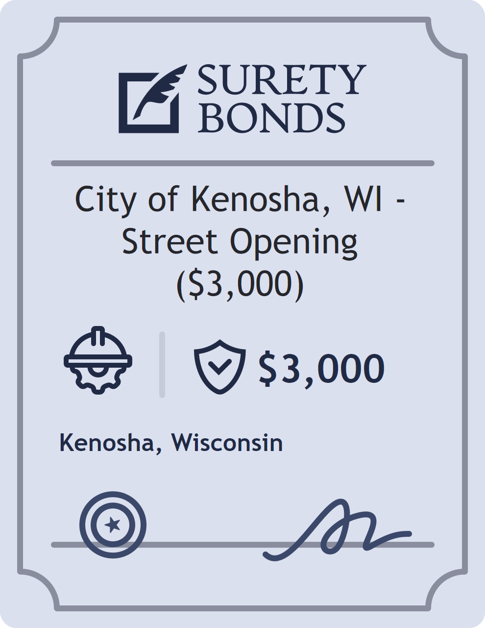 The City of Kenosha, WI – Street Opening ($3,000) is classified as a Government/Public Official Bonds with a $3,000 obligation in Wisconsin. Government/Public Official Bonds are surety bonds that ensure elected and appointed officials perform their duties faithfully and in accordance with the law. These bonds provide financial protection in cases of misconduct, negligence, or misuse of authority by public officials. The surety reviews financial strength, compliance history, and indemnity support before approving the obligation. Maintaining uninterrupted coverage for the entire 1 Year term is essential; lapses can trigger penalties, contract defaults, or license suspension in Wisconsin. Underwriters typically request financial statements, references, and proof of licensing before quoting terms so they can evaluate repayment capacity. Throughout the bond term, the principal must maintain accurate books, respond to regulator inquiries, and remediate any complaints to prevent a claim. Many authorities in Wisconsin also require renewal certificates 30 to 60 days in advance, and failure to provide proof can halt permitting or bid submissions. The $3,000 limit demonstrates to customers, partners, and oversight agencies that the bonded party maintains a reliable, surety-backed source of funds dedicated to ongoing compliance.