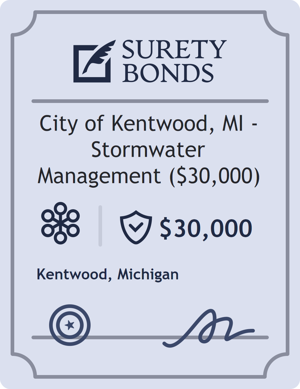 The City of Kentwood, MI – Stormwater Management ($30,000) is classified as a Miscellaneous Bonds with a $30,000 obligation in Michigan. Miscellaneous Bonds cover a wide range of non-standard surety bond requirements. They act as financial protection in cases where state or federal regulations require assurance of compliance and ethical conduct. The surety reviews financial strength, compliance history, and indemnity support before approving the obligation. Maintaining uninterrupted coverage for the entire 1 Year term is essential; lapses can trigger penalties, contract defaults, or license suspension in Michigan. Underwriters typically request financial statements, references, and proof of licensing before quoting terms so they can evaluate repayment capacity. Throughout the bond term, the principal must maintain accurate books, respond to regulator inquiries, and remediate any complaints to prevent a claim. Many authorities in Michigan also require renewal certificates 30 to 60 days in advance, and failure to provide proof can halt permitting or bid submissions. The $30,000 limit demonstrates to customers, partners, and oversight agencies that the bonded party maintains a reliable, surety-backed source of funds dedicated to ongoing compliance. The obligee for this bond is Kentwood.