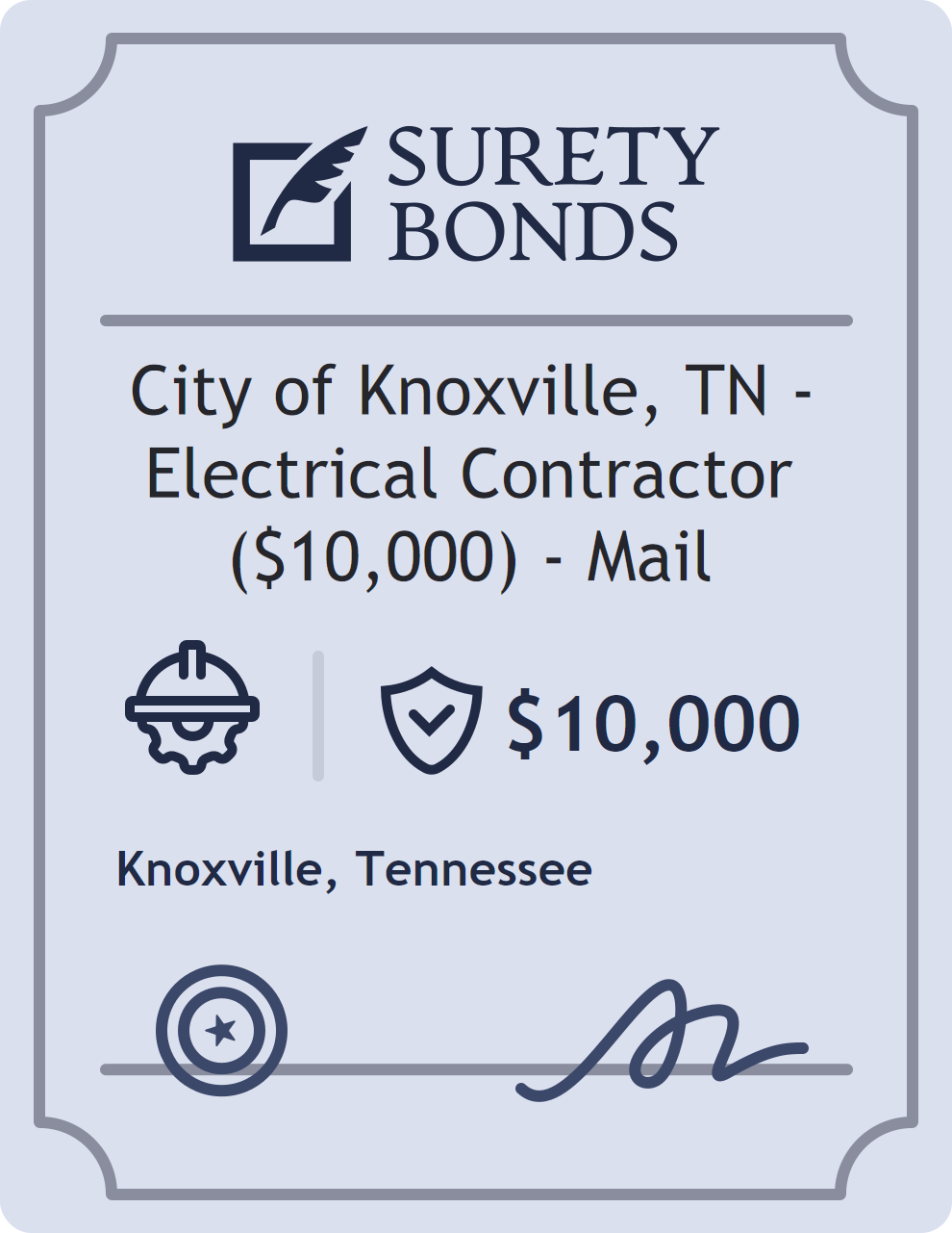 The City of Knoxville, TN – Electrical Contractor ($10,000) – Mail is classified as a Contractor Bonds with a $10,000 obligation in Tennessee. Contractor Bonds are surety bonds required for individuals or businesses performing construction work. They guarantee that contractors will comply with building codes, licensing requirements, and contractual obligations. The bond provides financial protection to property owners and the public in cases of poor workmanship, regulatory violations, or unfinished work. The surety reviews financial strength, compliance history, and indemnity support before approving the obligation. Maintaining uninterrupted coverage for the entire 1 Year term is essential; lapses can trigger penalties, contract defaults, or license suspension in Tennessee. Underwriters typically request financial statements, references, and proof of licensing before quoting terms so they can evaluate repayment capacity. Throughout the bond term, the principal must maintain accurate books, respond to regulator inquiries, and remediate any complaints to prevent a claim. Many authorities in Tennessee also require renewal certificates 30 to 60 days in advance, and failure to provide proof can halt permitting or bid submissions. The $10,000 limit demonstrates to customers, partners, and oversight agencies that the bonded party maintains a reliable, surety-backed source of funds dedicated to ongoing compliance. The obligee for this bond is Knoxville.