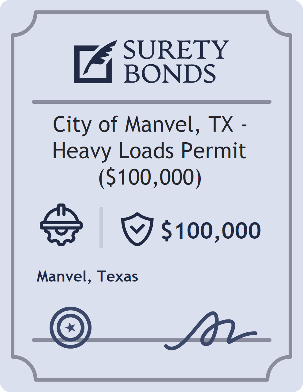 The City of Manvel, TX – Heavy Loads Permit ($100,000) is classified as a Contractor Bonds with a $100,000 obligation in Texas. Contractor Bonds are surety bonds required for individuals or businesses performing construction work. They guarantee that contractors will comply with building codes, licensing requirements, and contractual obligations. The bond provides financial protection to property owners and the public in cases of poor workmanship, regulatory violations, or unfinished work. The surety reviews financial strength, compliance history, and indemnity support before approving the obligation. Maintaining uninterrupted coverage for the entire 1 Year term is essential; lapses can trigger penalties, contract defaults, or license suspension in Texas. Underwriters typically request financial statements, references, and proof of licensing before quoting terms so they can evaluate repayment capacity. Throughout the bond term, the principal must maintain accurate books, respond to regulator inquiries, and remediate any complaints to prevent a claim. Many authorities in Texas also require renewal certificates 30 to 60 days in advance, and failure to provide proof can halt permitting or bid submissions. The $100,000 limit demonstrates to customers, partners, and oversight agencies that the bonded party maintains a reliable, surety-backed source of funds dedicated to ongoing compliance. The obligee for this bond is Manvel.
