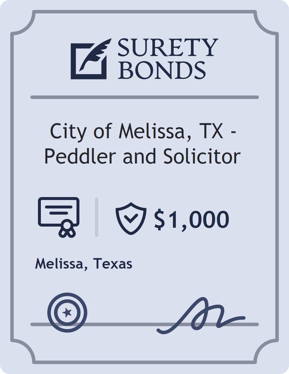 The City of Melissa, TX – Peddler and Solicitor is classified as a Professional License Bonds with a $1,000.00 obligation in Texas. Professional License Bonds are surety bonds required for licensed professionals across various industries. They guarantee compliance with licensing laws and ethical standards, protecting clients and regulatory bodies from harm. The surety reviews financial strength, compliance history, and indemnity support before approving the obligation. Maintaining uninterrupted coverage for the entire 1 Year term is essential; lapses can trigger penalties, contract defaults, or license suspension in Texas. Underwriters typically request financial statements, references, and proof of licensing before quoting terms so they can evaluate repayment capacity. Throughout the bond term, the principal must maintain accurate books, respond to regulator inquiries, and remediate any complaints to prevent a claim. Many authorities in Texas also require renewal certificates 30 to 60 days in advance, and failure to provide proof can halt permitting or bid submissions. The $1,000.00 limit demonstrates to customers, partners, and oversight agencies that the bonded party maintains a reliable, surety-backed source of funds dedicated to ongoing compliance. The obligee for this bond is Melissa.