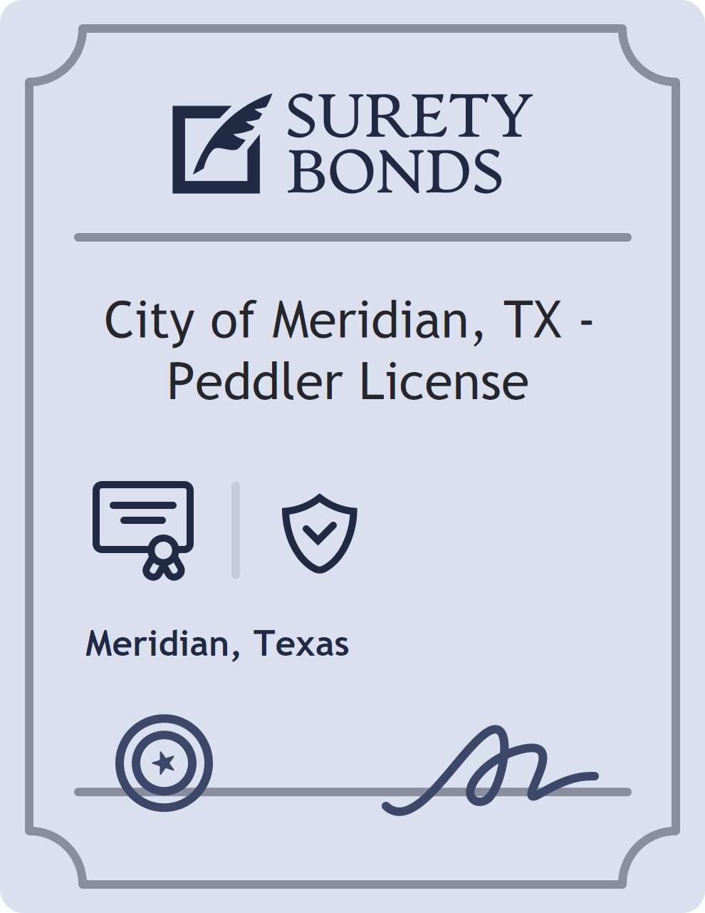 The City of Meridian, TX – Peddler License is classified as a Professional License Bonds with a $10,000 obligation in Texas. Professional License Bonds are surety bonds required for licensed professionals across various industries. They guarantee compliance with licensing laws and ethical standards, protecting clients and regulatory bodies from harm. The surety reviews financial strength, compliance history, and indemnity support before approving the obligation. Maintaining uninterrupted coverage for the entire 1 Year term is essential; lapses can trigger penalties, contract defaults, or license suspension in Texas. Underwriters typically request financial statements, references, and proof of licensing before quoting terms so they can evaluate repayment capacity. Throughout the bond term, the principal must maintain accurate books, respond to regulator inquiries, and remediate any complaints to prevent a claim. Many authorities in Texas also require renewal certificates 30 to 60 days in advance, and failure to provide proof can halt permitting or bid submissions. The $10,000 limit demonstrates to customers, partners, and oversight agencies that the bonded party maintains a reliable, surety-backed source of funds dedicated to ongoing compliance. The obligee for this bond is Meridian.