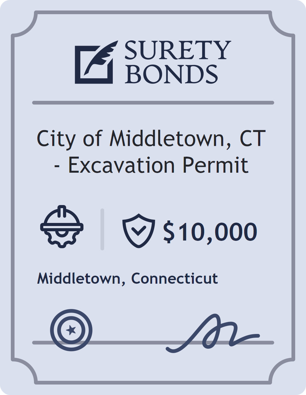 The City of Middletown, CT – Excavation Permit is classified as a Contractor Bonds with a $10,000.00 obligation in Connecticut. Contractor Bonds are surety bonds required for individuals or businesses performing construction work. They guarantee that contractors will comply with building codes, licensing requirements, and contractual obligations. The bond provides financial protection to property owners and the public in cases of poor workmanship, regulatory violations, or unfinished work. The surety reviews financial strength, compliance history, and indemnity support before approving the obligation. Maintaining uninterrupted coverage for the entire 1 Year term is essential; lapses can trigger penalties, contract defaults, or license suspension in Connecticut. Underwriters typically request financial statements, references, and proof of licensing before quoting terms so they can evaluate repayment capacity. Throughout the bond term, the principal must maintain accurate books, respond to regulator inquiries, and remediate any complaints to prevent a claim. Many authorities in Connecticut also require renewal certificates 30 to 60 days in advance, and failure to provide proof can halt permitting or bid submissions. The $10,000.00 limit demonstrates to customers, partners, and oversight agencies that the bonded party maintains a reliable, surety-backed source of funds dedicated to ongoing compliance. The obligee for this bond is Middletown.