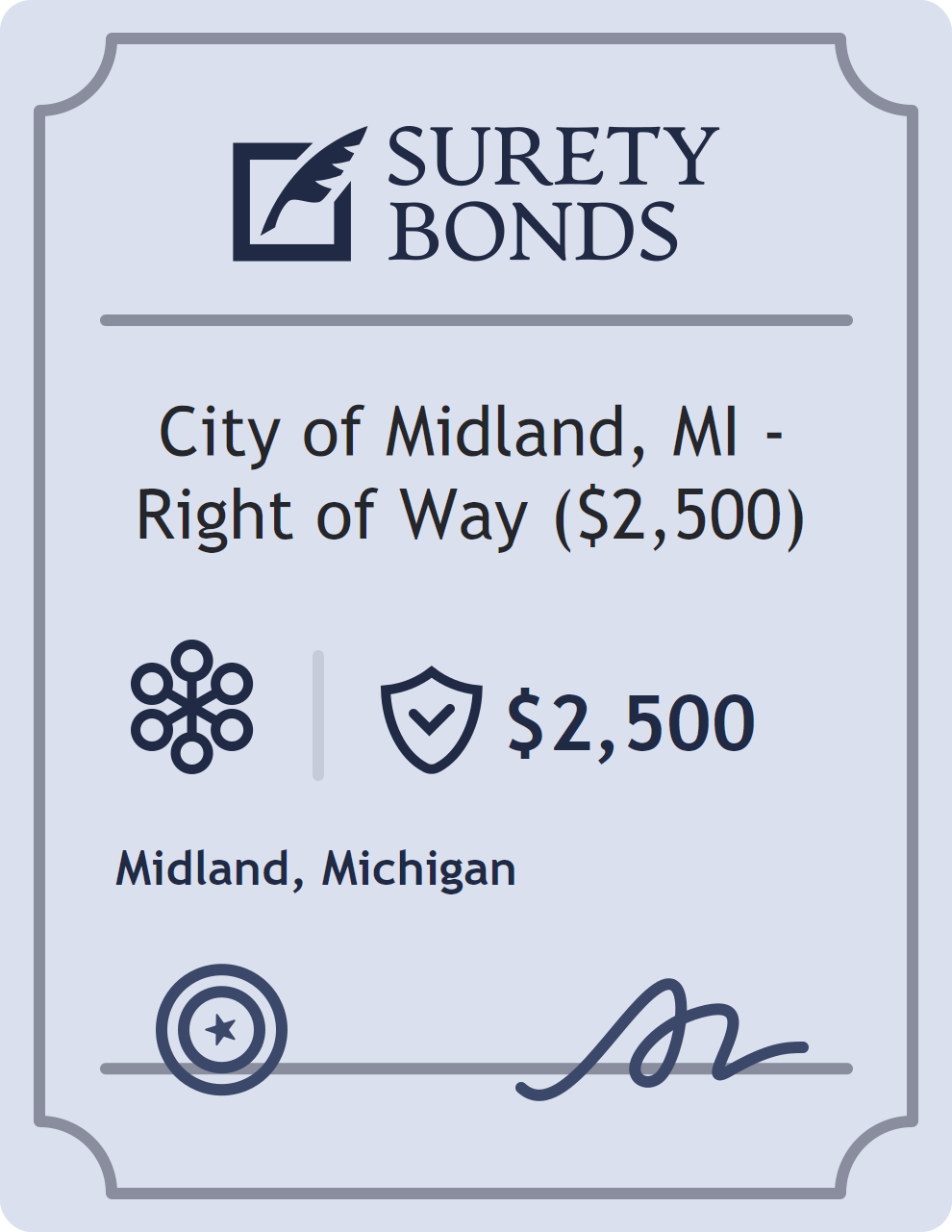 The City of Midland, MI – Right of Way ($2,500) is classified as a Miscellaneous Bonds with a $2,500 obligation in Michigan. Miscellaneous Bonds cover a wide range of non-standard surety bond requirements. They act as financial protection in cases where state or federal regulations require assurance of compliance and ethical conduct. The surety reviews financial strength, compliance history, and indemnity support before approving the obligation. Maintaining uninterrupted coverage for the entire 1 Year term is essential; lapses can trigger penalties, contract defaults, or license suspension in Michigan. Underwriters typically request financial statements, references, and proof of licensing before quoting terms so they can evaluate repayment capacity. Throughout the bond term, the principal must maintain accurate books, respond to regulator inquiries, and remediate any complaints to prevent a claim. Many authorities in Michigan also require renewal certificates 30 to 60 days in advance, and failure to provide proof can halt permitting or bid submissions. The $2,500 limit demonstrates to customers, partners, and oversight agencies that the bonded party maintains a reliable, surety-backed source of funds dedicated to ongoing compliance. The obligee for this bond is Midland.