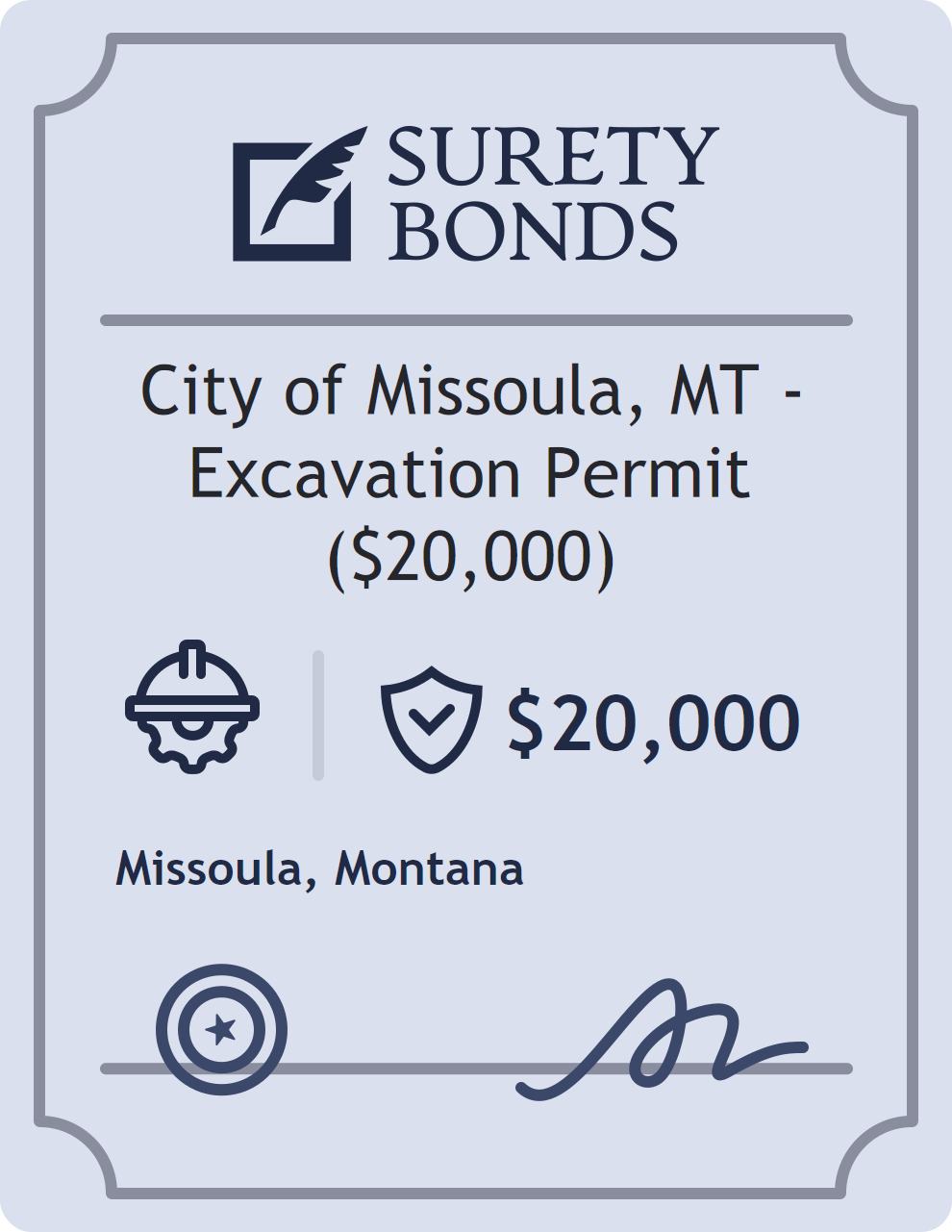 The City of Missoula, MT – Excavation Permit ($20,000) is classified as a Contractor Bonds with a $20,000 obligation in Montana. Contractor Bonds are surety bonds required for individuals or businesses performing construction work. They guarantee that contractors will comply with building codes, licensing requirements, and contractual obligations. The bond provides financial protection to property owners and the public in cases of poor workmanship, regulatory violations, or unfinished work. The surety reviews financial strength, compliance history, and indemnity support before approving the obligation. Maintaining uninterrupted coverage for the entire 1 Year term is essential; lapses can trigger penalties, contract defaults, or license suspension in Montana. Underwriters typically request financial statements, references, and proof of licensing before quoting terms so they can evaluate repayment capacity. Throughout the bond term, the principal must maintain accurate books, respond to regulator inquiries, and remediate any complaints to prevent a claim. Many authorities in Montana also require renewal certificates 30 to 60 days in advance, and failure to provide proof can halt permitting or bid submissions. The $20,000 limit demonstrates to customers, partners, and oversight agencies that the bonded party maintains a reliable, surety-backed source of funds dedicated to ongoing compliance. The obligee for this bond is Missoula.