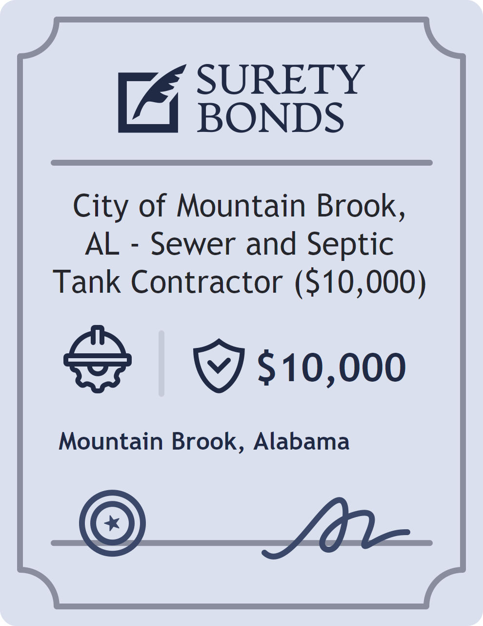 The City of Mountain Brook, AL – Sewer and Septic Tank Contractor ($10,000) is classified as a Contractor Bonds with a $10,000 obligation in Alabama. Contractor Bonds are surety bonds required for individuals or businesses performing construction work. They guarantee that contractors will comply with building codes, licensing requirements, and contractual obligations. The bond provides financial protection to property owners and the public in cases of poor workmanship, regulatory violations, or unfinished work. The surety reviews financial strength, compliance history, and indemnity support before approving the obligation. Maintaining uninterrupted coverage for the entire 1 Year term is essential; lapses can trigger penalties, contract defaults, or license suspension in Alabama. Underwriters typically request financial statements, references, and proof of licensing before quoting terms so they can evaluate repayment capacity. Throughout the bond term, the principal must maintain accurate books, respond to regulator inquiries, and remediate any complaints to prevent a claim. Many authorities in Alabama also require renewal certificates 30 to 60 days in advance, and failure to provide proof can halt permitting or bid submissions. The $10,000 limit demonstrates to customers, partners, and oversight agencies that the bonded party maintains a reliable, surety-backed source of funds dedicated to ongoing compliance. The obligee for this bond is Mountain Brook.