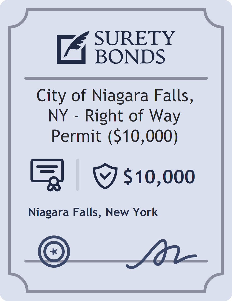 The City of Niagara Falls, NY – Right of Way Permit ($10,000) is classified as a Professional License Bonds with a $10,000 obligation in New York. Professional License Bonds are surety bonds required for licensed professionals across various industries. They guarantee compliance with licensing laws and ethical standards, protecting clients and regulatory bodies from harm. The surety reviews financial strength, compliance history, and indemnity support before approving the obligation. Maintaining uninterrupted coverage for the entire 1 Year term is essential; lapses can trigger penalties, contract defaults, or license suspension in New York. Underwriters typically request financial statements, references, and proof of licensing before quoting terms so they can evaluate repayment capacity. Throughout the bond term, the principal must maintain accurate books, respond to regulator inquiries, and remediate any complaints to prevent a claim. Many authorities in New York also require renewal certificates 30 to 60 days in advance, and failure to provide proof can halt permitting or bid submissions. The $10,000 limit demonstrates to customers, partners, and oversight agencies that the bonded party maintains a reliable, surety-backed source of funds dedicated to ongoing compliance. The obligee for this bond is Niagara Falls.