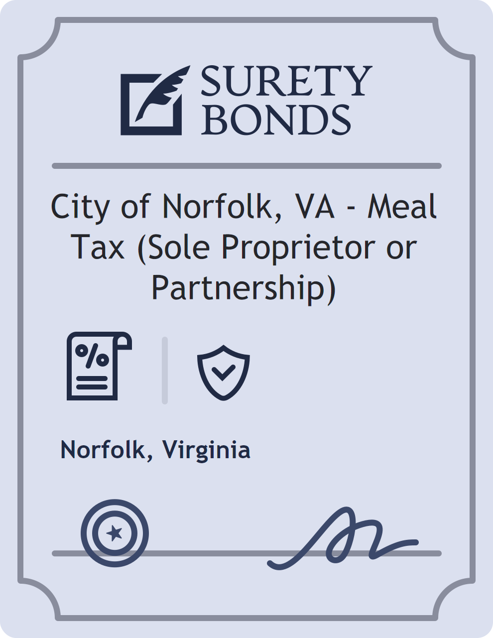 The City of Norfolk, VA – Meal Tax (Sole Proprietor or Partnership) is classified as a Sales Tax Bonds with a $10,000 obligation in Virginia. Sales Tax Bonds are surety bonds required for businesses responsible for collecting and remitting sales tax. They guarantee that the business will pay taxes owed to the state, ensuring compliance with tax laws. The surety reviews financial strength, compliance history, and indemnity support before approving the obligation. Maintaining uninterrupted coverage for the entire 1 Year term is essential; lapses can trigger penalties, contract defaults, or license suspension in Virginia. Underwriters typically request financial statements, references, and proof of licensing before quoting terms so they can evaluate repayment capacity. Throughout the bond term, the principal must maintain accurate books, respond to regulator inquiries, and remediate any complaints to prevent a claim. Many authorities in Virginia also require renewal certificates 30 to 60 days in advance, and failure to provide proof can halt permitting or bid submissions. The $10,000 limit demonstrates to customers, partners, and oversight agencies that the bonded party maintains a reliable, surety-backed source of funds dedicated to ongoing compliance. The obligee for this bond is Norfolk.