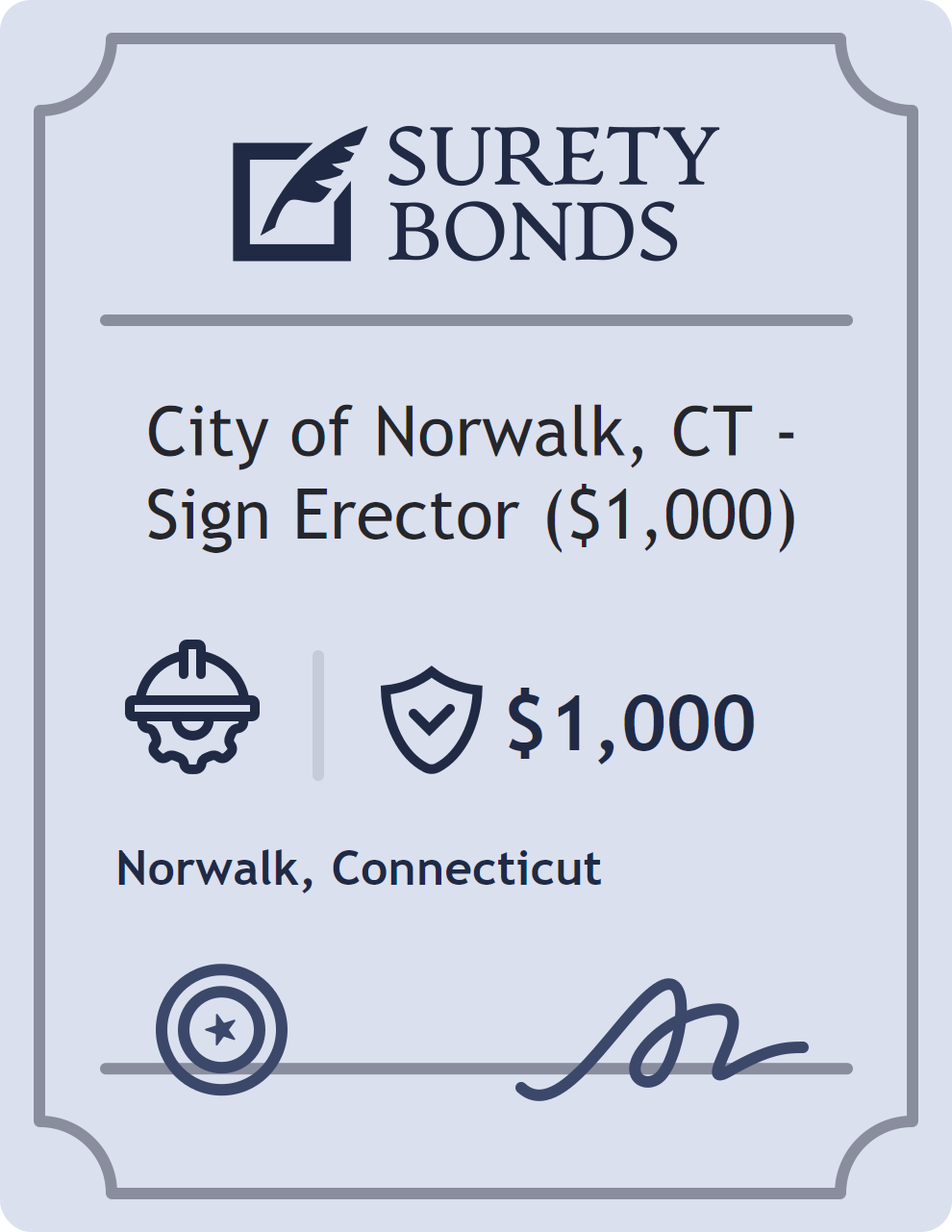The City of Norwalk, CT – Sign Erector ($1,000) is classified as a Contractor Bonds with a $1,000 obligation in Connecticut. Contractor Bonds are surety bonds required for individuals or businesses performing construction work. They guarantee that contractors will comply with building codes, licensing requirements, and contractual obligations. The bond provides financial protection to property owners and the public in cases of poor workmanship, regulatory violations, or unfinished work. The surety reviews financial strength, compliance history, and indemnity support before approving the obligation. Maintaining uninterrupted coverage for the entire 1 Year term is essential; lapses can trigger penalties, contract defaults, or license suspension in Connecticut. Underwriters typically request financial statements, references, and proof of licensing before quoting terms so they can evaluate repayment capacity. Throughout the bond term, the principal must maintain accurate books, respond to regulator inquiries, and remediate any complaints to prevent a claim. Many authorities in Connecticut also require renewal certificates 30 to 60 days in advance, and failure to provide proof can halt permitting or bid submissions. The $1,000 limit demonstrates to customers, partners, and oversight agencies that the bonded party maintains a reliable, surety-backed source of funds dedicated to ongoing compliance. The obligee for this bond is Norwalk.