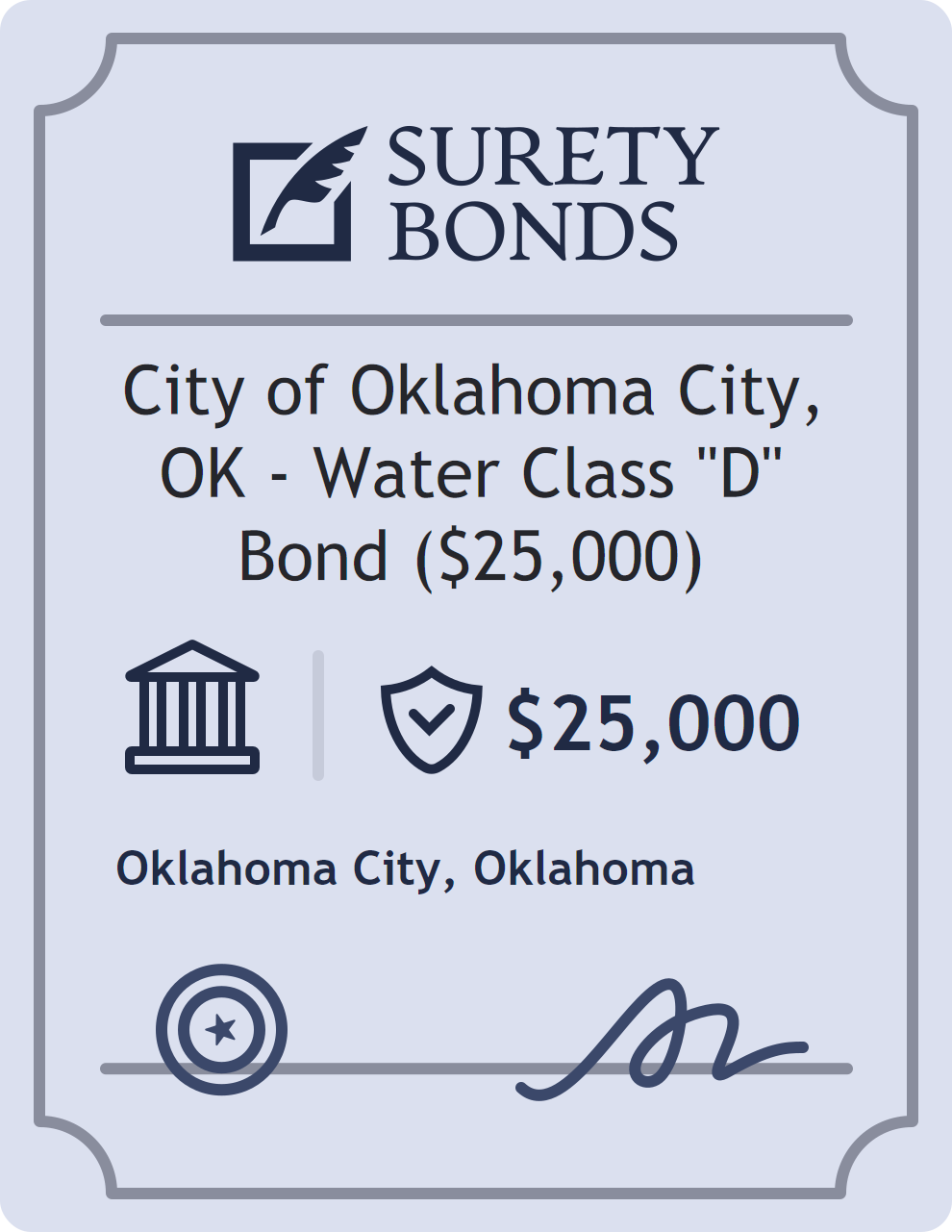The City of Oklahoma City, OK – Water Class “D” Bond ($25,000) is classified as a Government/Public Official Bonds with a $25,000 obligation in Oklahoma. Government/Public Official Bonds are surety bonds that ensure elected and appointed officials perform their duties faithfully and in accordance with the law. These bonds provide financial protection in cases of misconduct, negligence, or misuse of authority by public officials. The surety reviews financial strength, compliance history, and indemnity support before approving the obligation. Maintaining uninterrupted coverage for the entire 1 Year term is essential; lapses can trigger penalties, contract defaults, or license suspension in Oklahoma. Underwriters typically request financial statements, references, and proof of licensing before quoting terms so they can evaluate repayment capacity. Throughout the bond term, the principal must maintain accurate books, respond to regulator inquiries, and remediate any complaints to prevent a claim. Many authorities in Oklahoma also require renewal certificates 30 to 60 days in advance, and failure to provide proof can halt permitting or bid submissions. The $25,000 limit demonstrates to customers, partners, and oversight agencies that the bonded party maintains a reliable, surety-backed source of funds dedicated to ongoing compliance. The obligee for this bond is Oklahoma City.