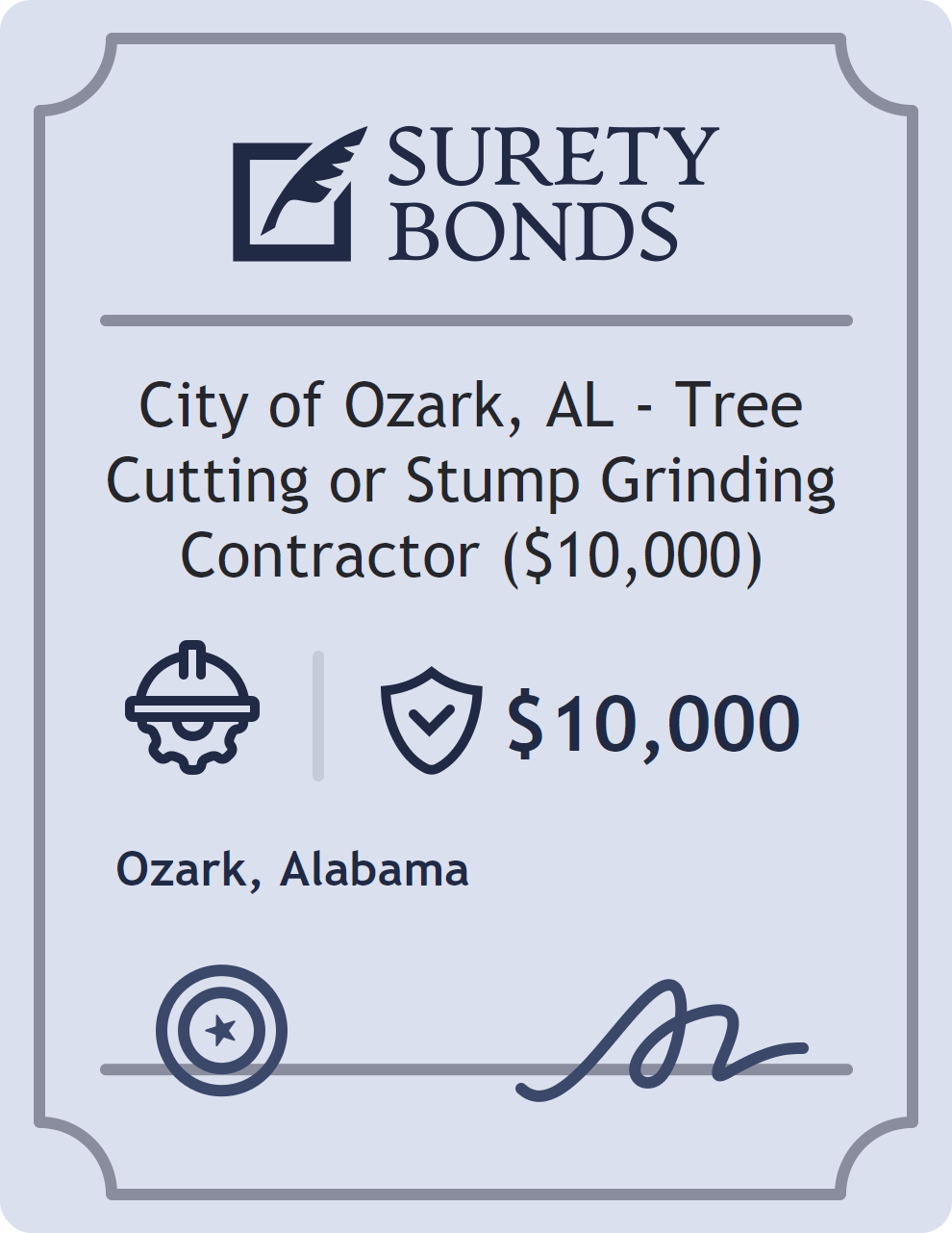 The City of Ozark, AL – Tree Cutting or Stump Grinding Contractor ($10,000) is classified as a Contractor Bonds with a $10,000 obligation in Alabama. Contractor Bonds are surety bonds required for individuals or businesses performing construction work. They guarantee that contractors will comply with building codes, licensing requirements, and contractual obligations. The bond provides financial protection to property owners and the public in cases of poor workmanship, regulatory violations, or unfinished work. The surety reviews financial strength, compliance history, and indemnity support before approving the obligation. Maintaining uninterrupted coverage for the entire 1 Year term is essential; lapses can trigger penalties, contract defaults, or license suspension in Alabama. Underwriters typically request financial statements, references, and proof of licensing before quoting terms so they can evaluate repayment capacity. Throughout the bond term, the principal must maintain accurate books, respond to regulator inquiries, and remediate any complaints to prevent a claim. Many authorities in Alabama also require renewal certificates 30 to 60 days in advance, and failure to provide proof can halt permitting or bid submissions. The $10,000 limit demonstrates to customers, partners, and oversight agencies that the bonded party maintains a reliable, surety-backed source of funds dedicated to ongoing compliance. The obligee for this bond is Ozark.